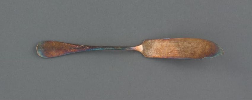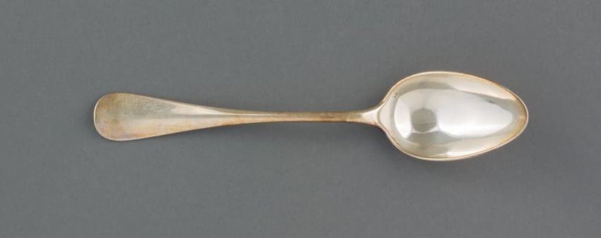 One of a set of five. Silver dinner fork. Fiddle handle with chamfered shoulders. Acanthus design and an engraved monogram on the handle. Four tines.
