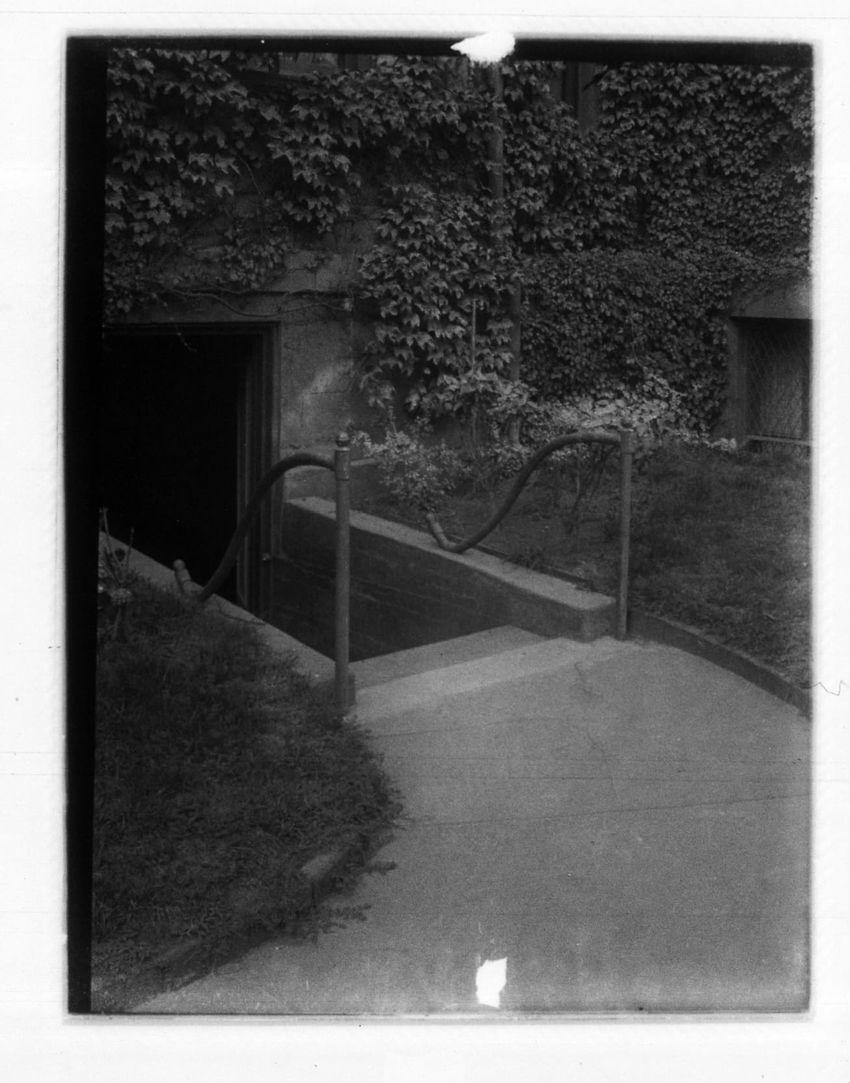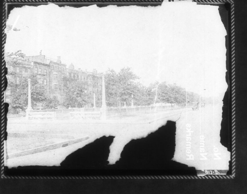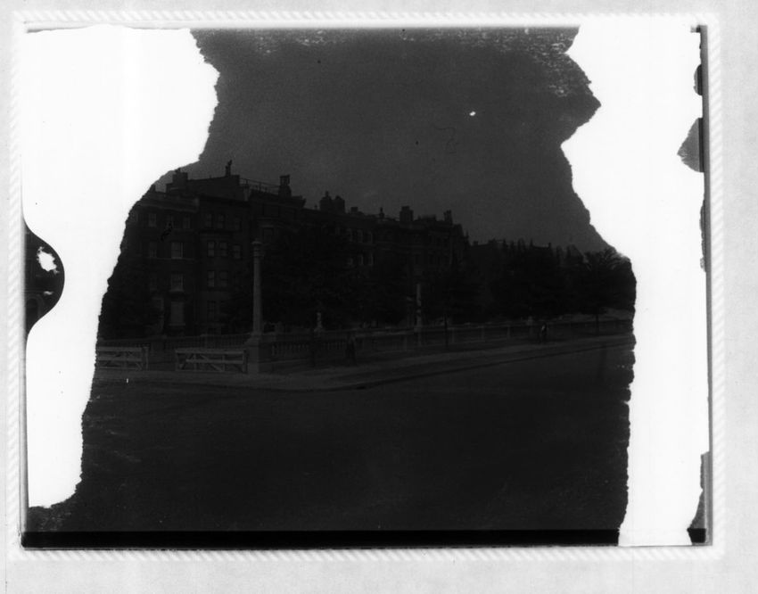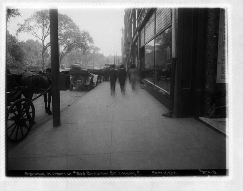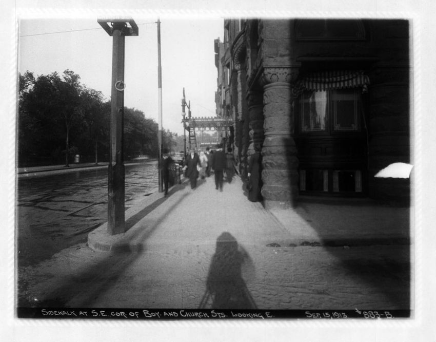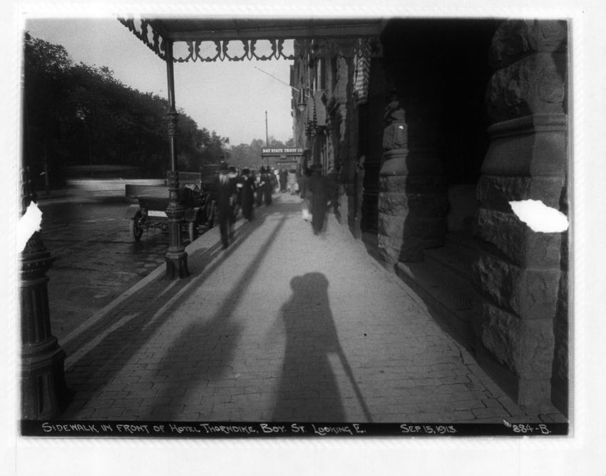 The photographer's shadow can be seen in this image of the Hotel Thorndike on Boylston Street.