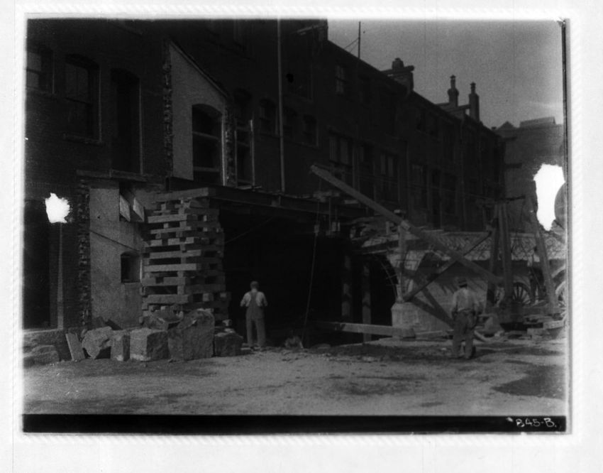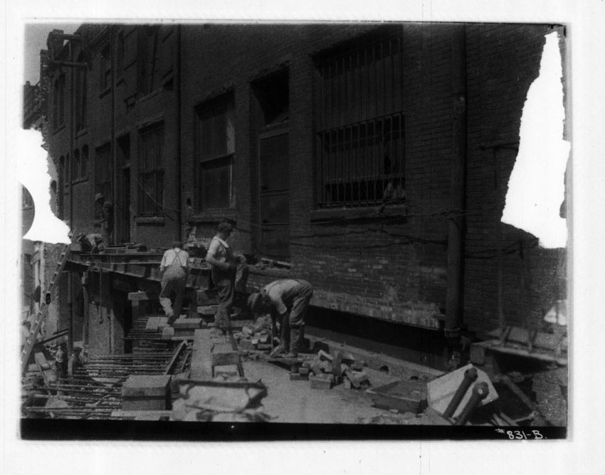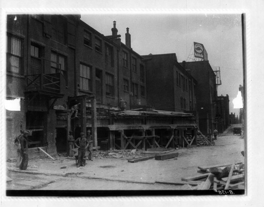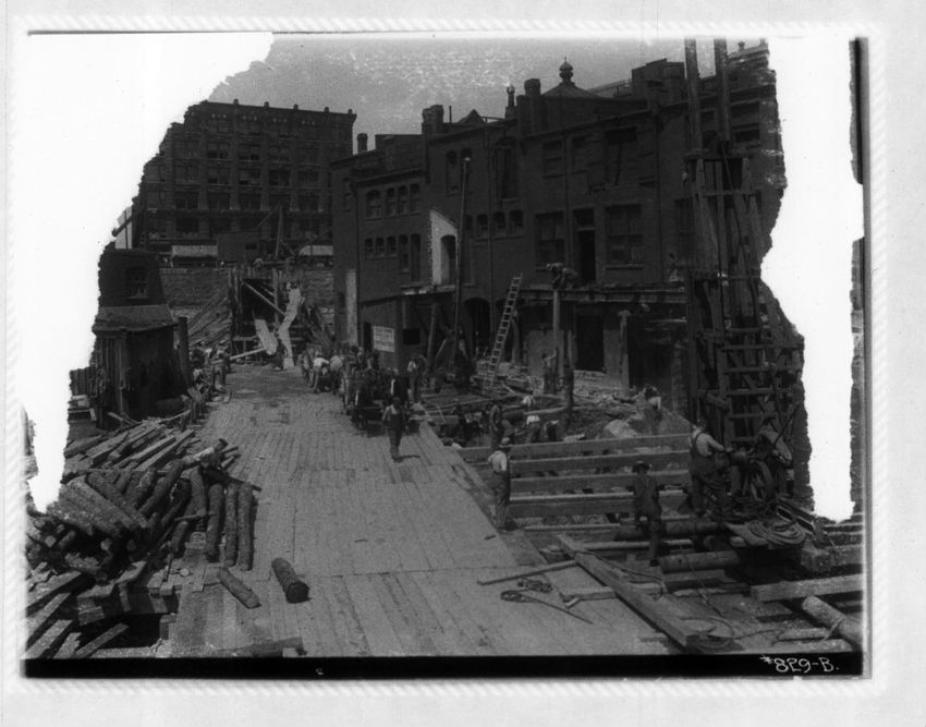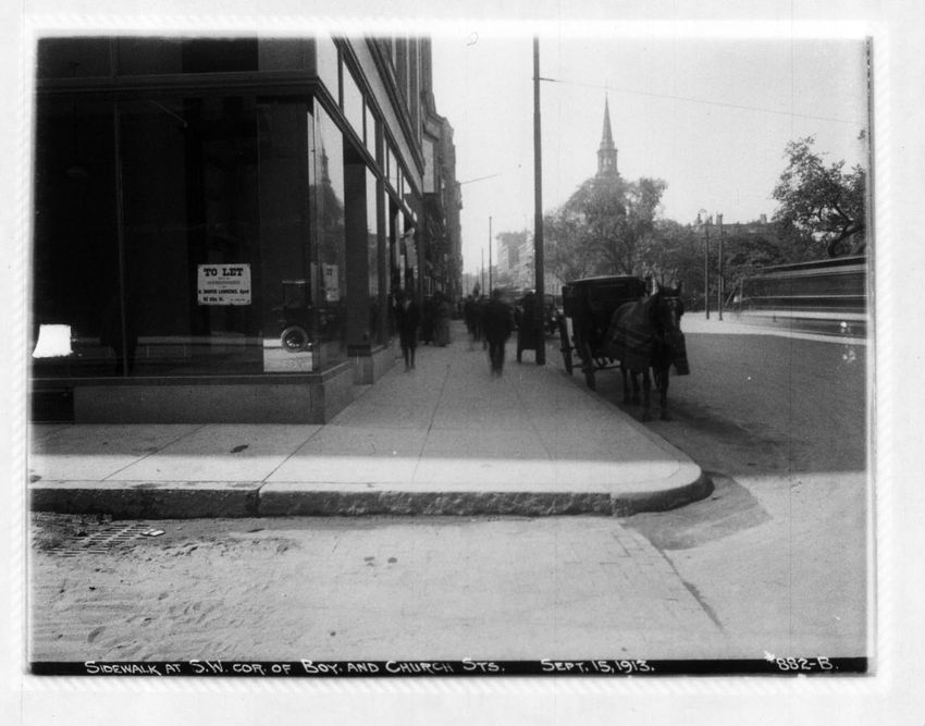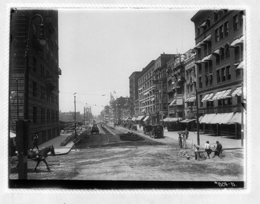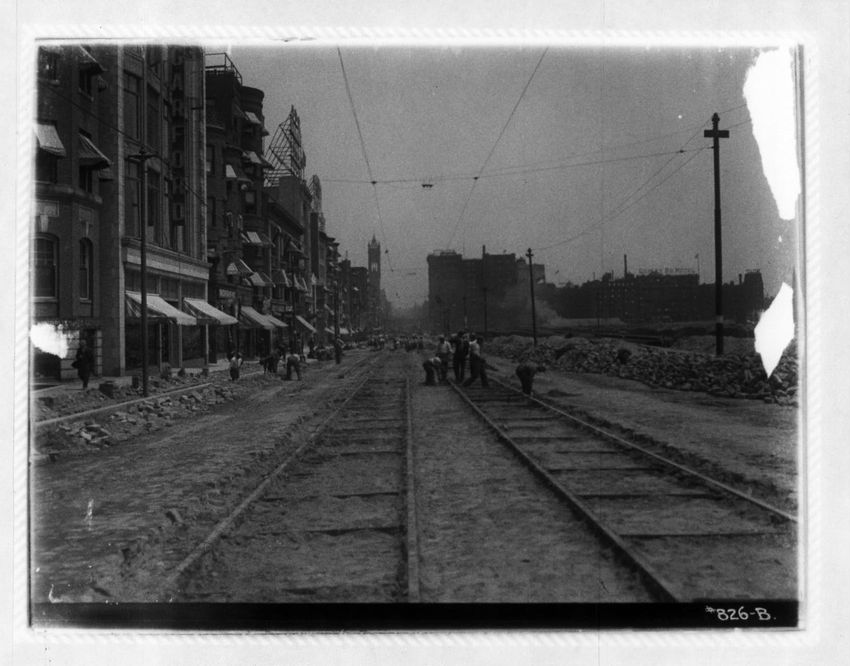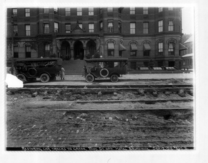 Work on the streetcar tracks is performed in front of the Hotel Brunswick. Part of Trinity Church can be seen on the right side of the image.