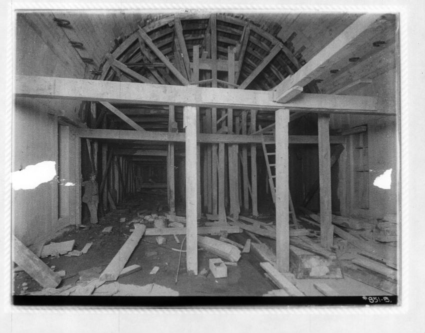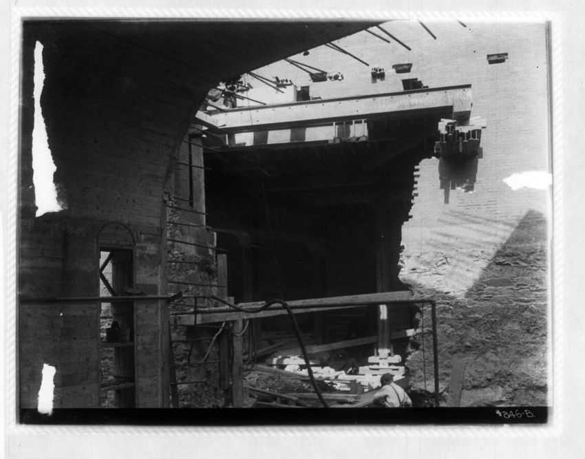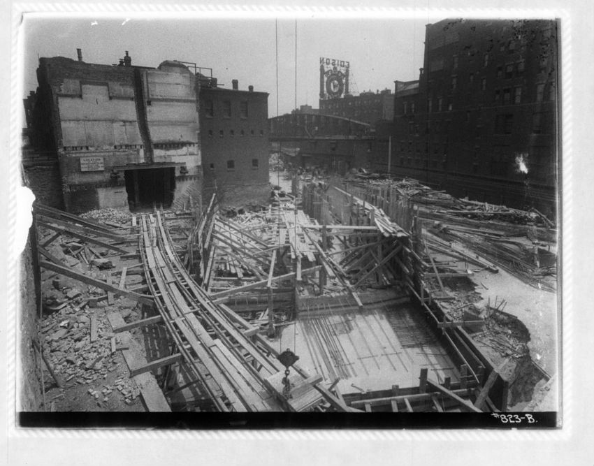 Subway construction work is seen in Copley Square. The Boston Public Library is on the left and the Old South Church is on the right side of the image.