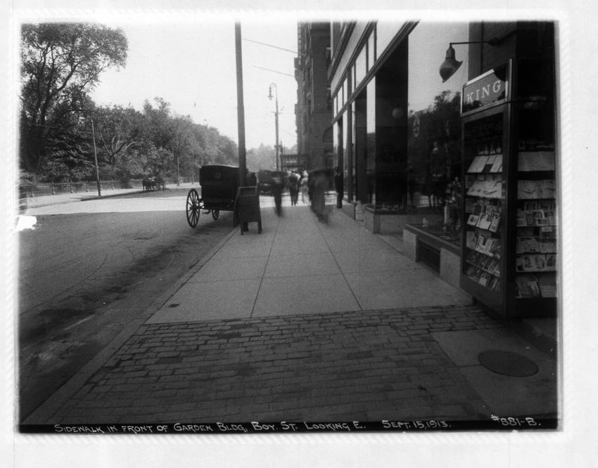 The building on the corner is the Garden Building with a "To let" sign in the windown. Arlington Street Church can be seen on the right in the background. The Public Garden is on the right side of the image. Automobiles and horse-drawn vehicles are parked on Boylston Street.