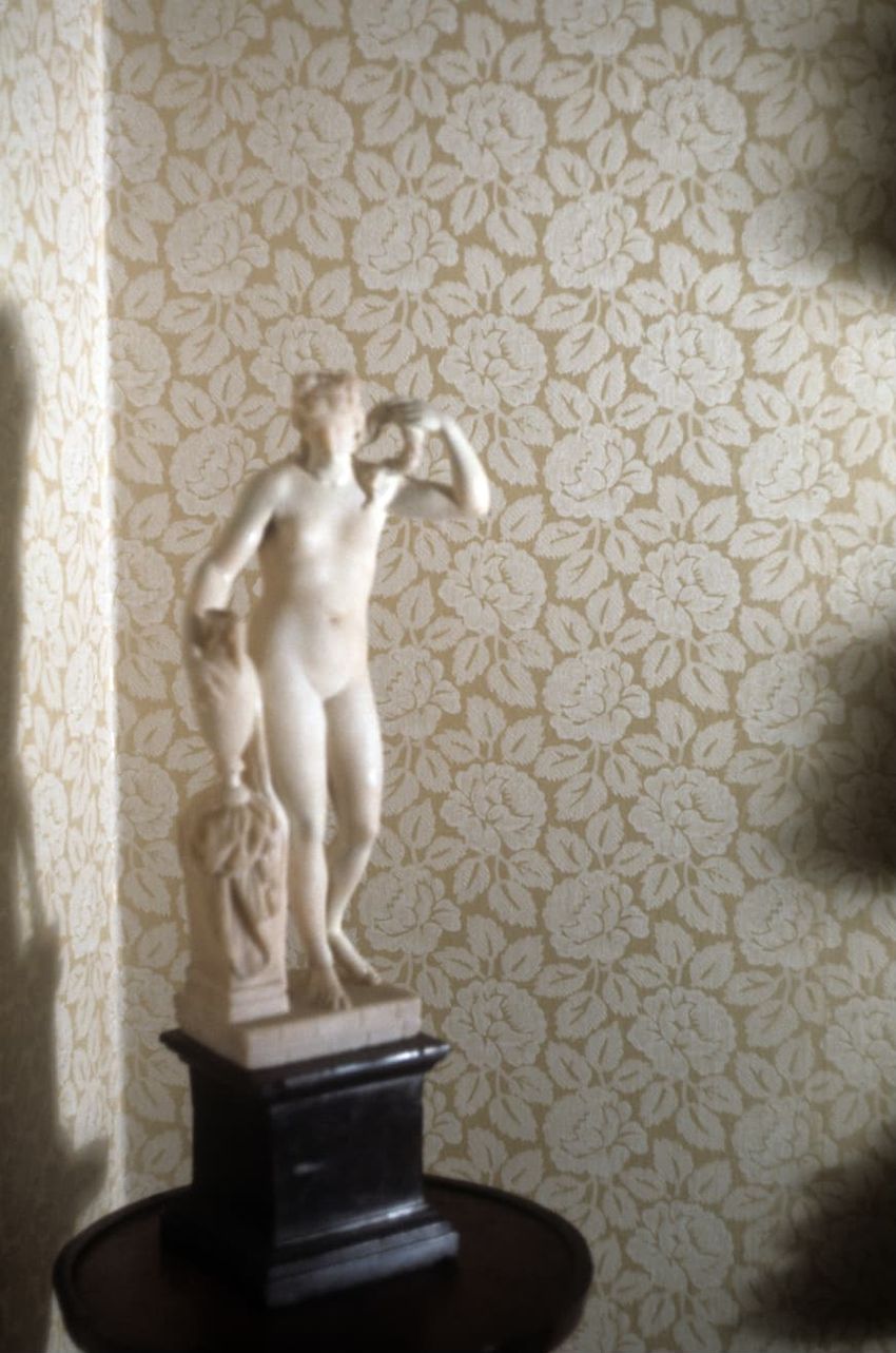 Pier mirror. White pine, gesso, gilt, paint, glass. Base of frame has gadrooning and small rope turning. Sides have large black and gilt rope turnings formed into knots at bases and loose untied strands as capitals. Corner blocks of base have lion's head bosses in black. Frieze of pediment displ...
