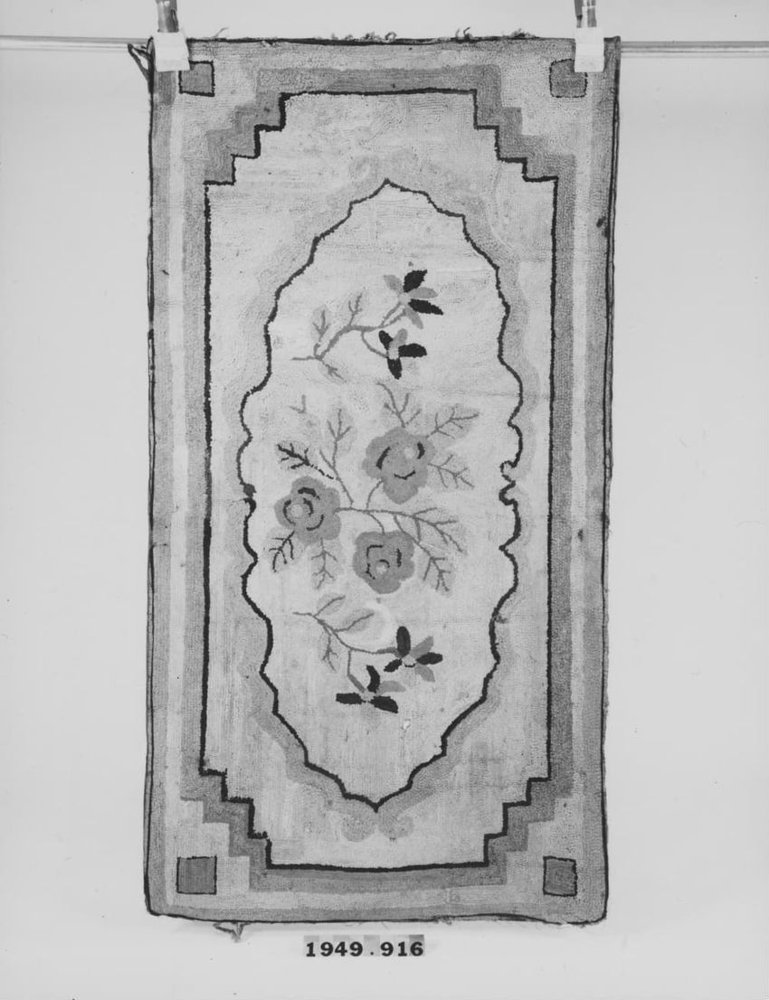 Rectangular woven wool rug. Tufted in strips. Two large red and pink roses, green leaves, grey ground, surrounded by cartouche and geometric designs. Red, orange, blue, light green on dark brown ground. Cotton warp.