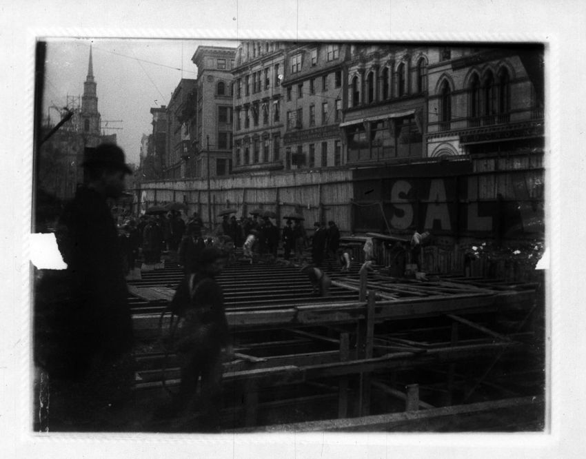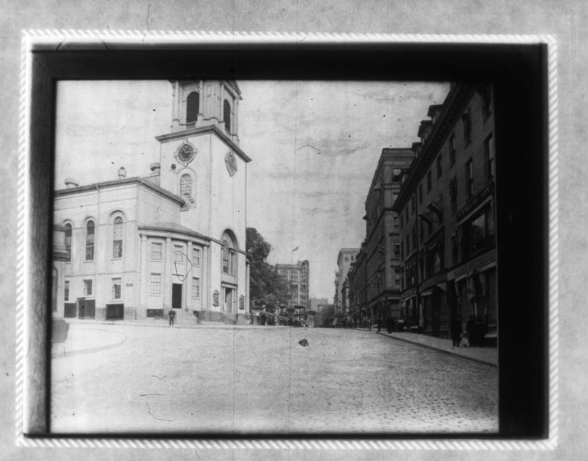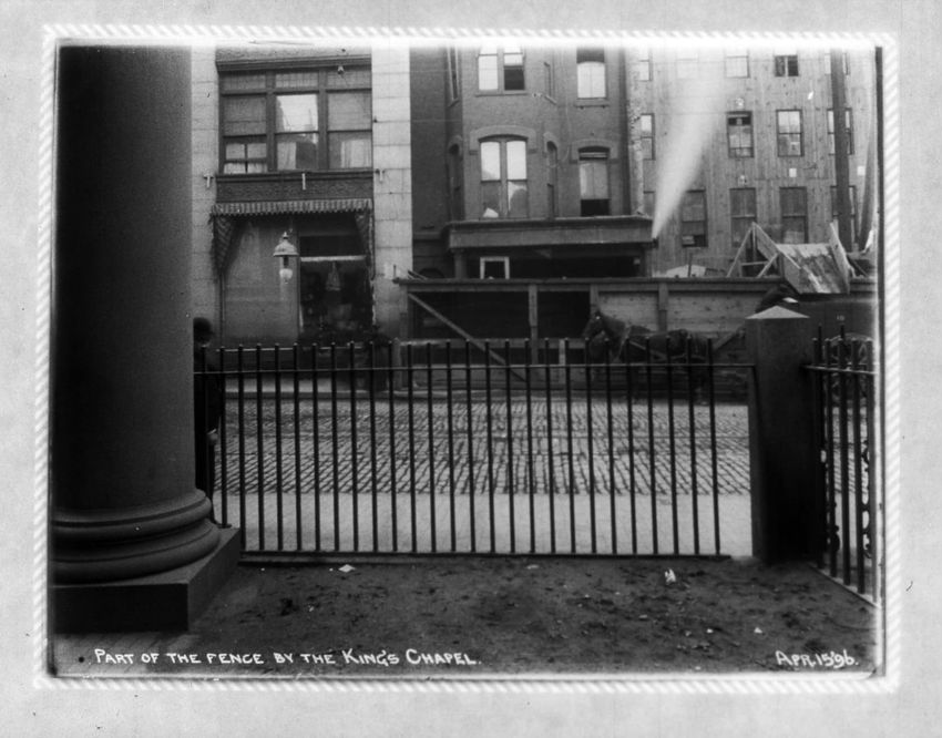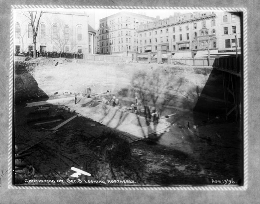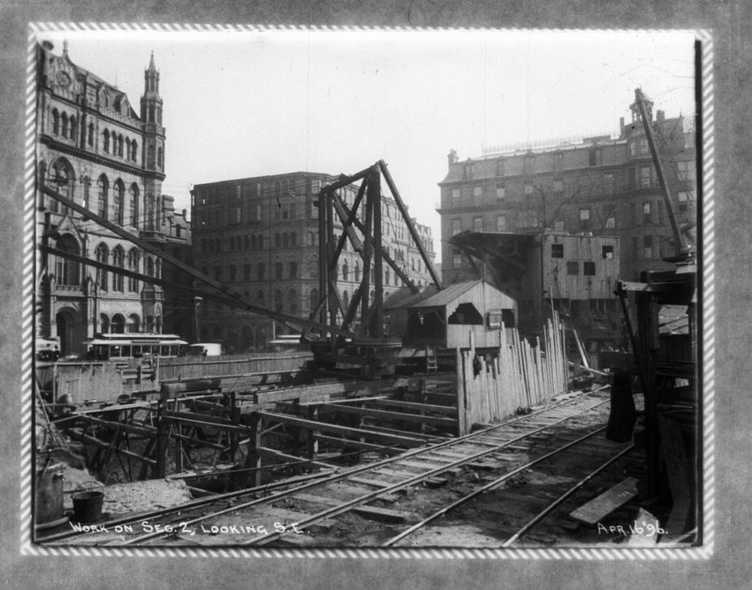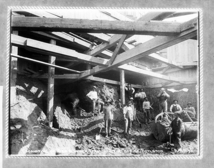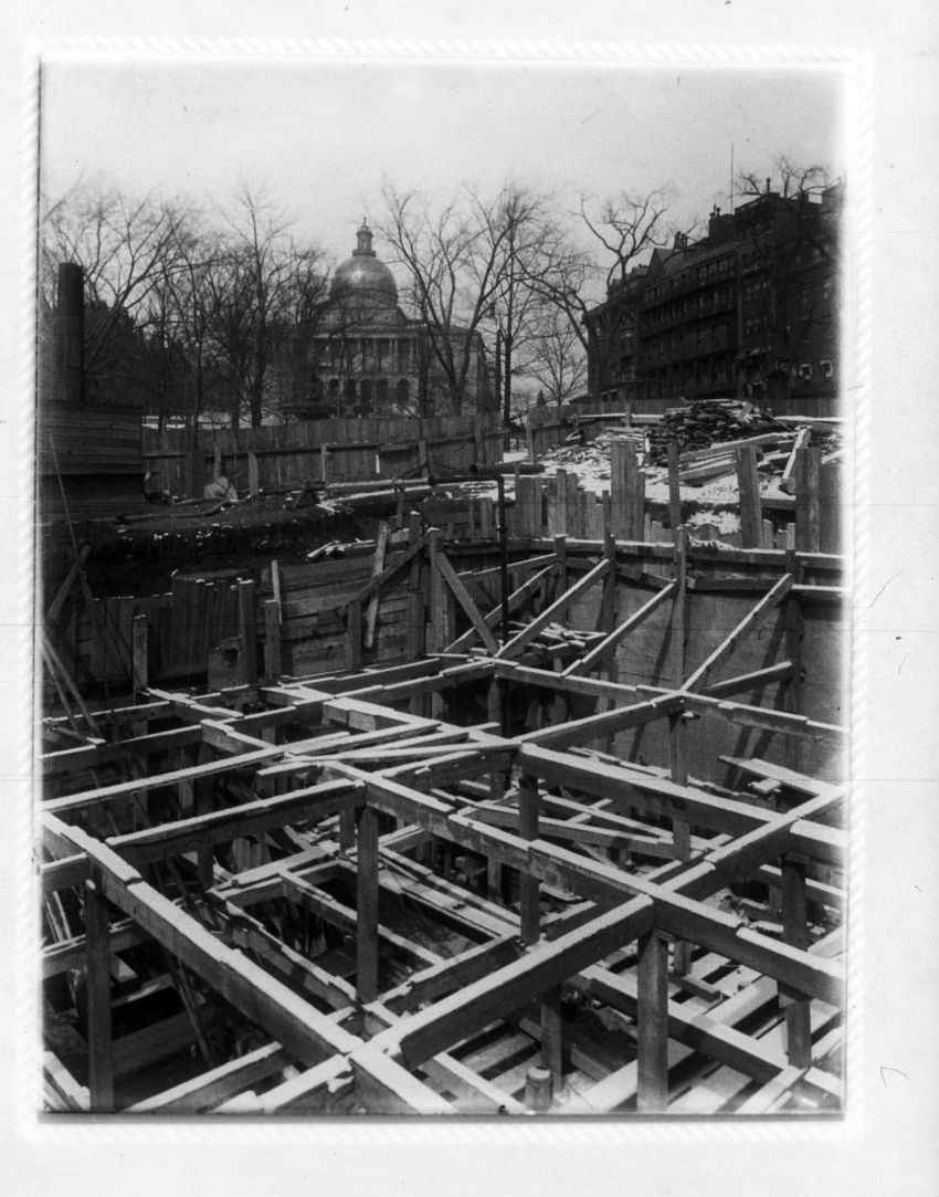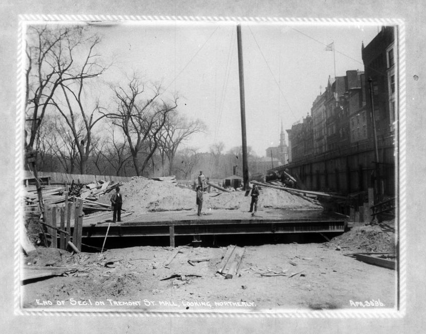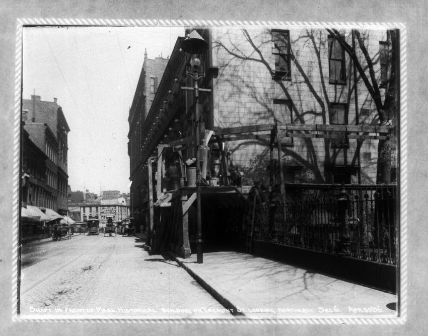 A subway construction site on Tremont Street, across from King's Chapel, is seen in the image.
