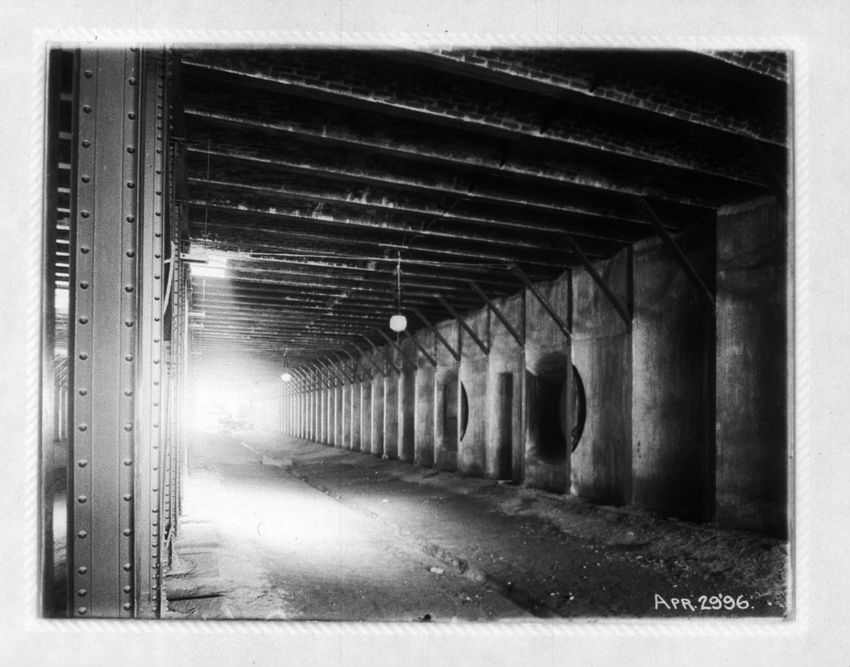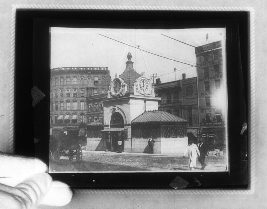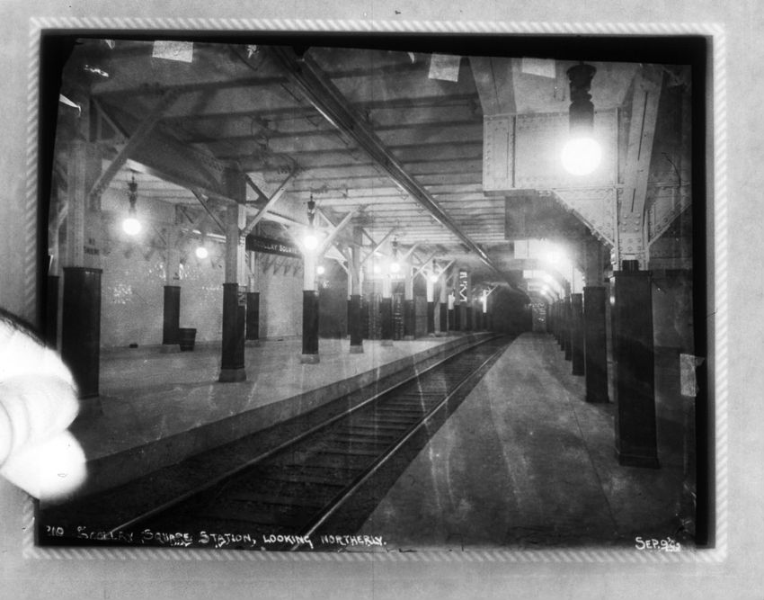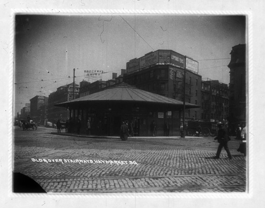 The Haymarket Subway Station can be seen in the image. There is a sign for the Brockway-Smith Corporation which sells doors, sashes and blinds.