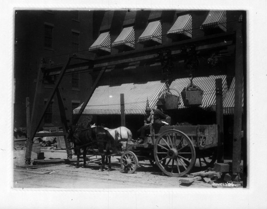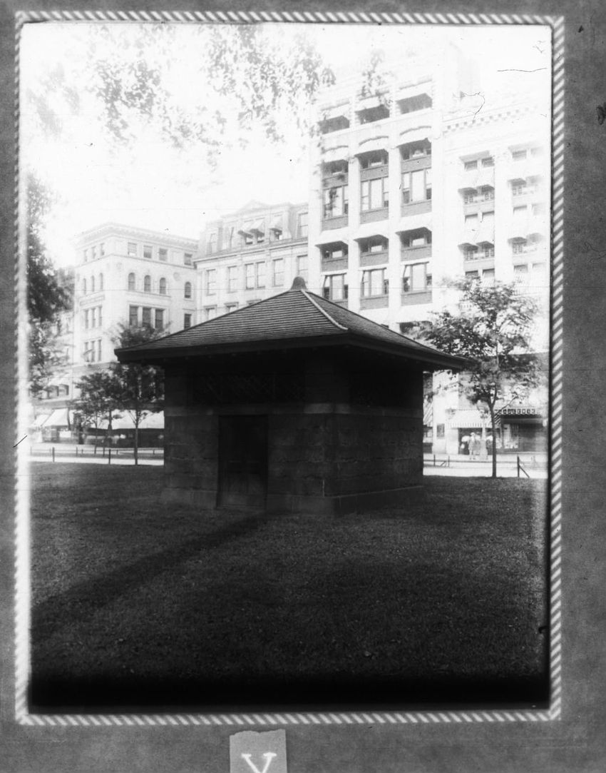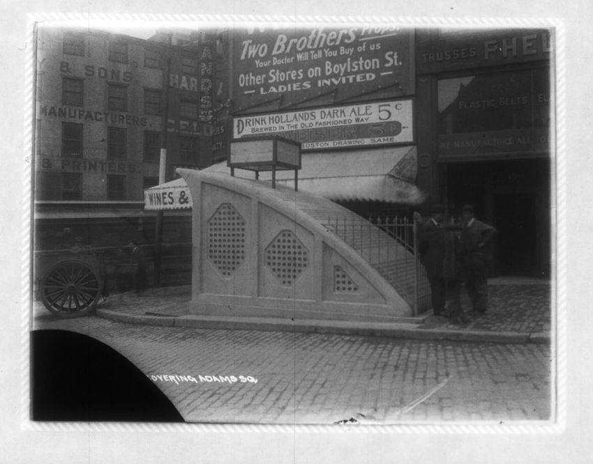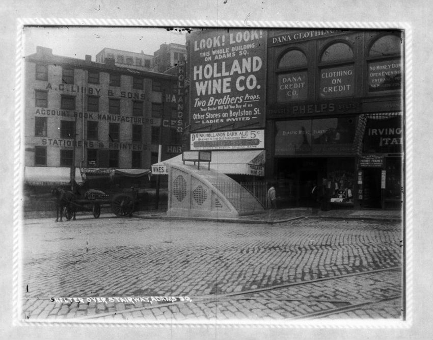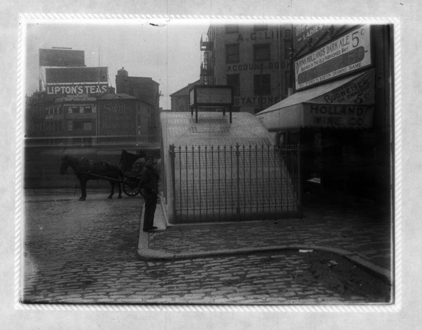 A horse-drawn vehicle can be seen behind the John Winthrop statue in Scollay Square.
