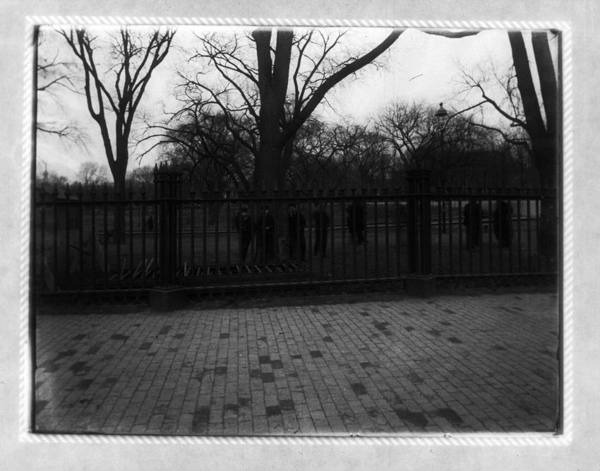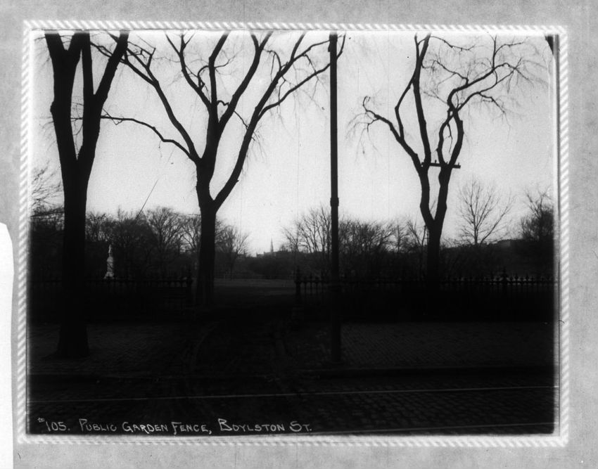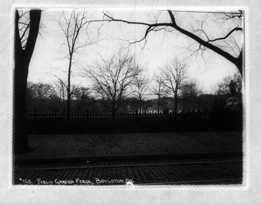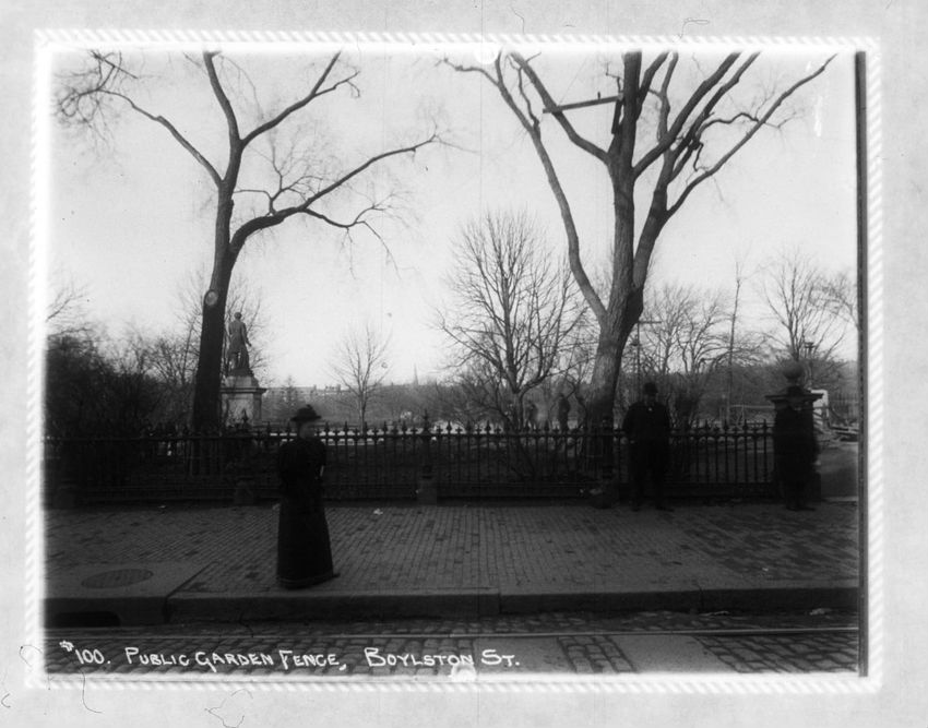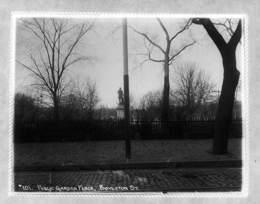 The Public Garden is seen through the fence on Boylston Street. The Charles Sumner statue is to the far right.
