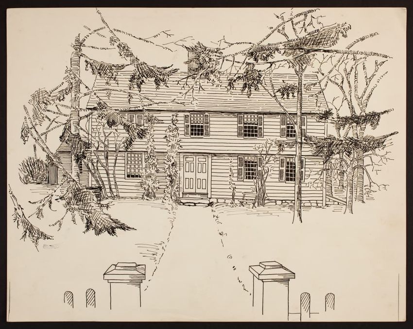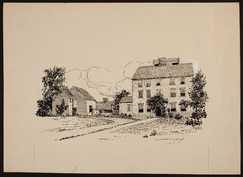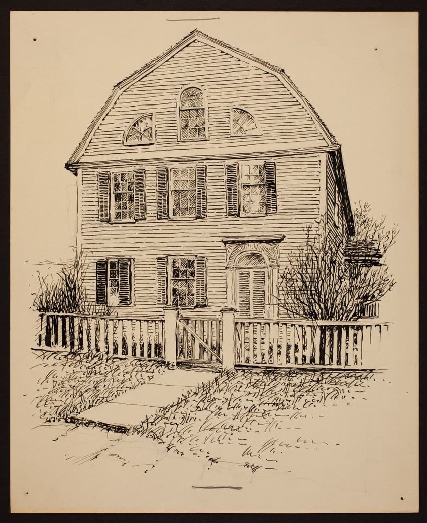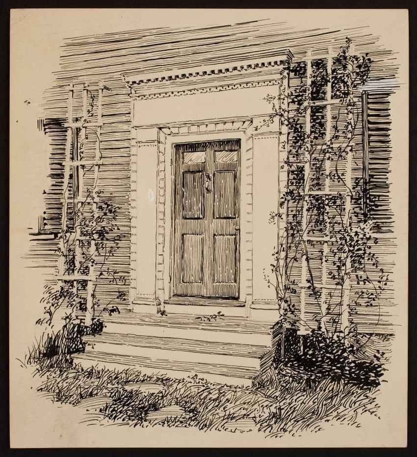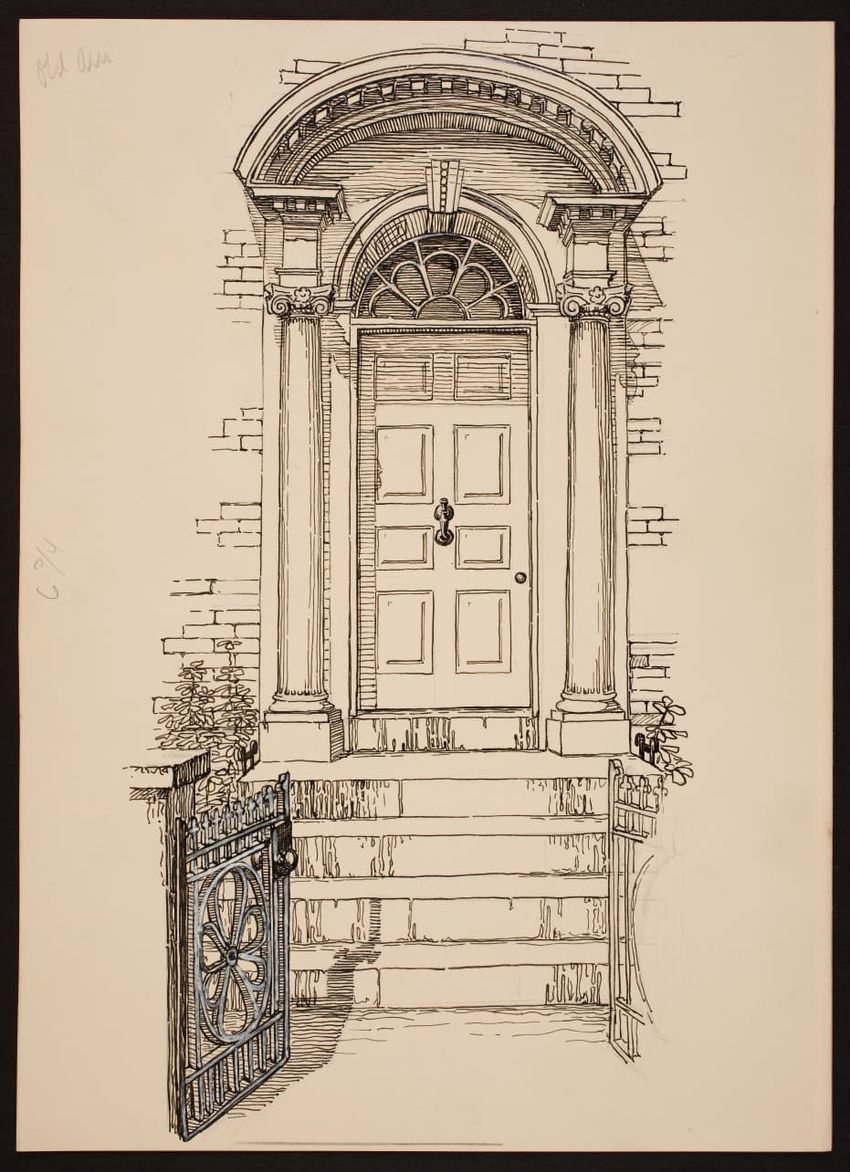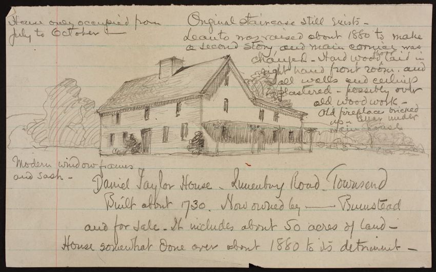 Rough sketch of fireplace and stairway from Bartlett House in Newburyport, built around 1805. Reverse is a menu from the Union Club. Stairway - Atkinson House in Newbury; Dalton Club.