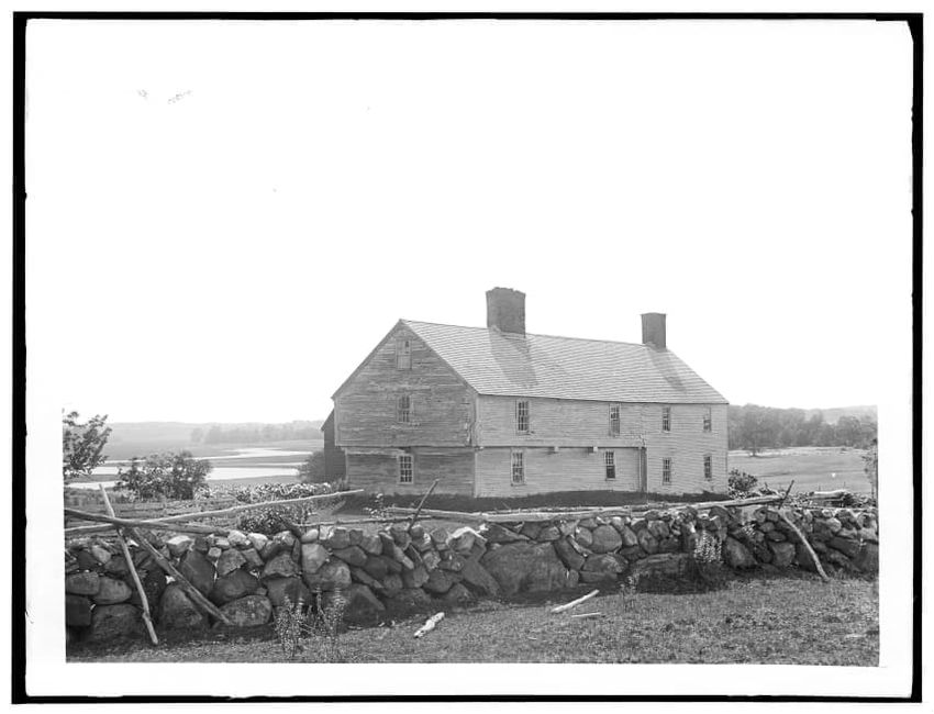 The image shows the Batchelder House in Wenham, Massachusetts. It features a wooden, two-story structure with a chimney, alongside an adjacent building, possibly a barn or shed, with open doors. Some chairs and a small amount of clutter are visible in the yard, as well as a few indistinct people eng...