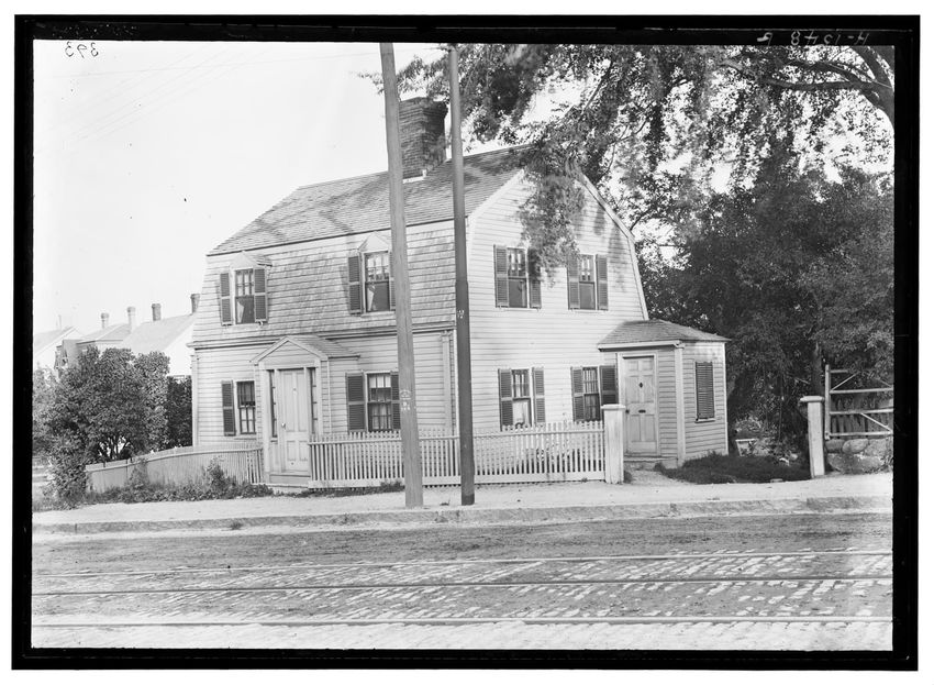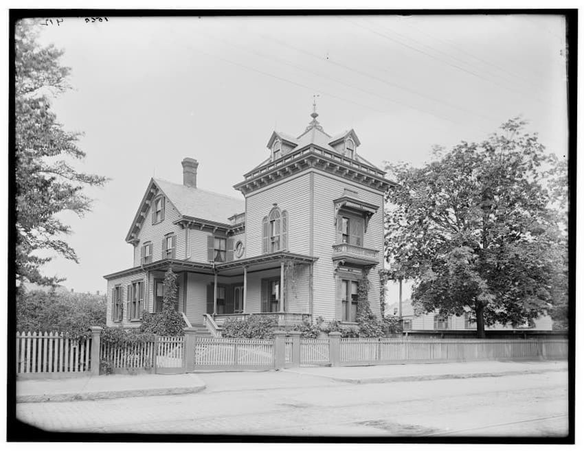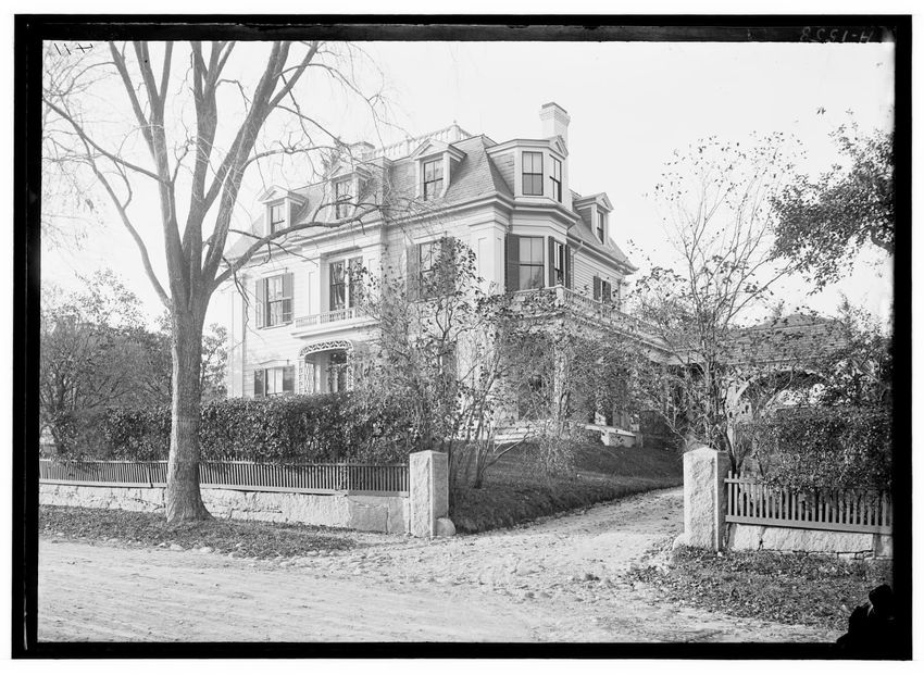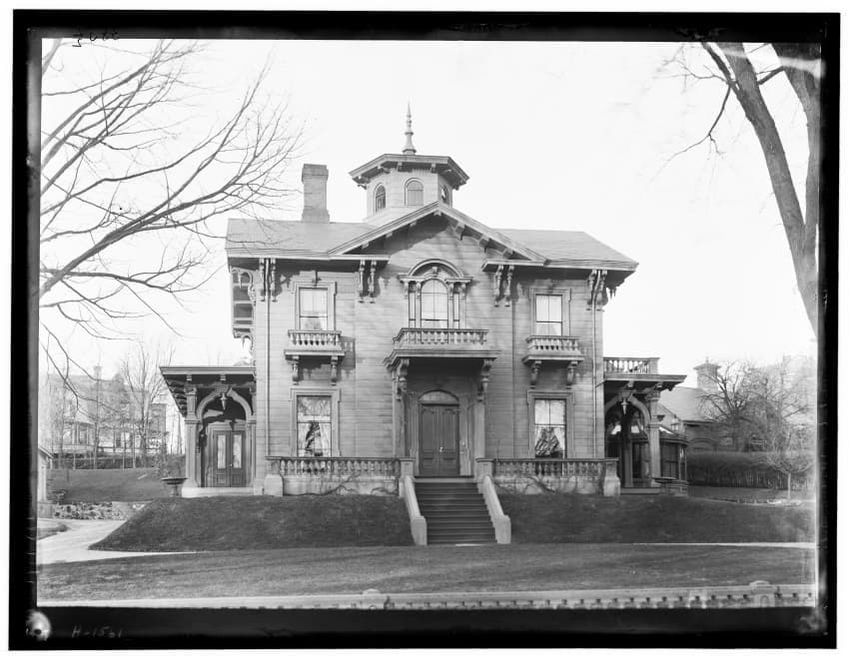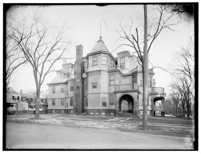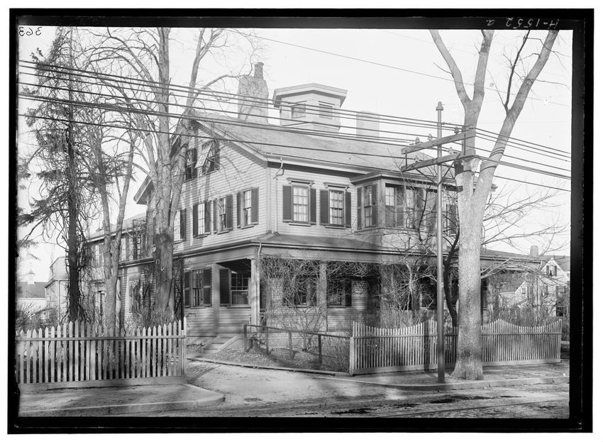 The image shows the Hunt House, a large, ornate, two-story building in Dorchester, Boston, Massachusetts. The house features intricate architectural details, including decorative brackets, a central entrance with a small canopy, and symmetrical windows. A small set of stairs leads to the main door, ...