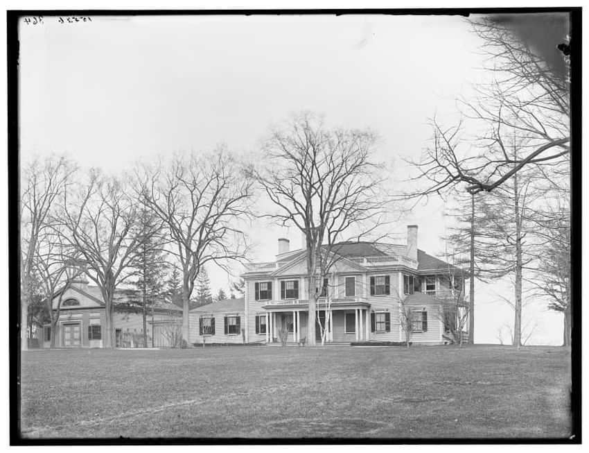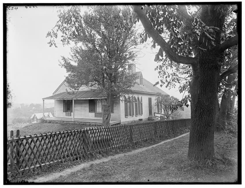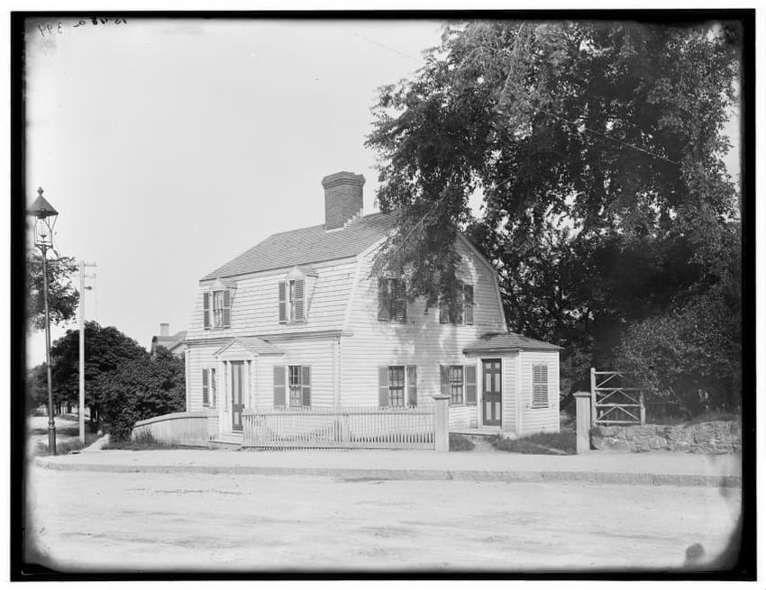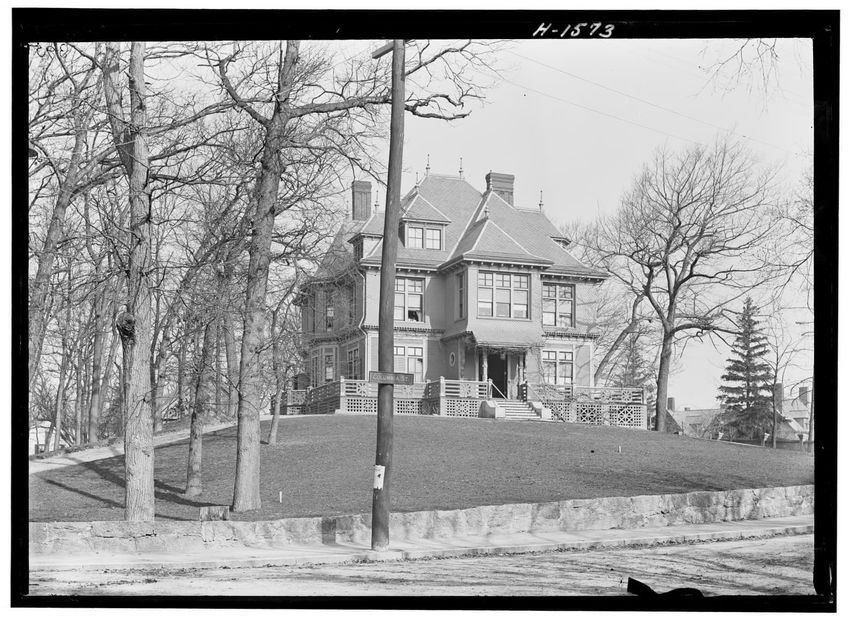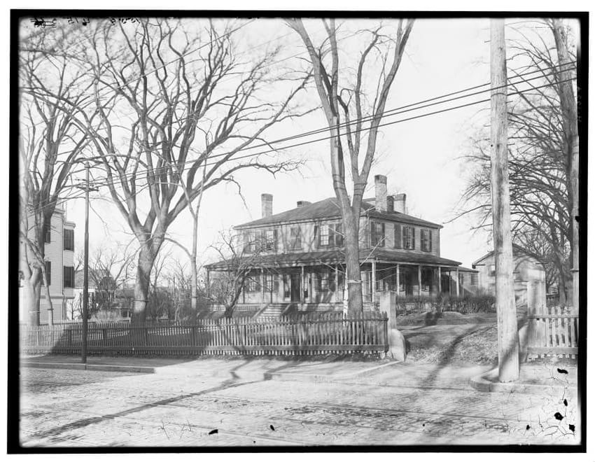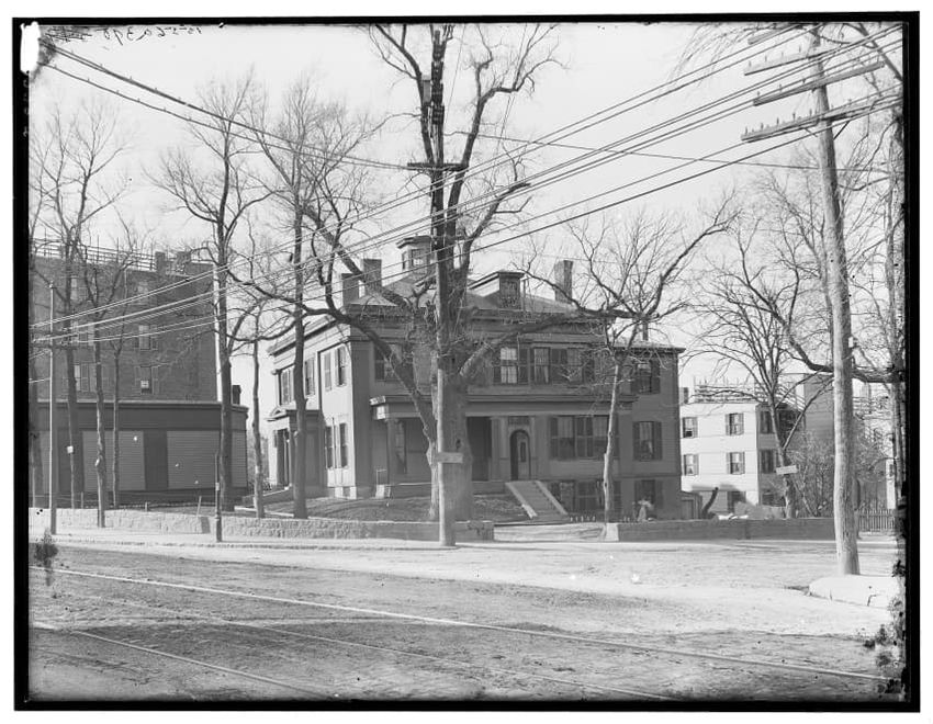 The image shows the Hunt House, a large, ornate, two-story building in Dorchester, Boston, Massachusetts. The house features intricate architectural details, including decorative brackets, a central entrance with a small canopy, and symmetrical windows. A small set of stairs leads to the main door, ...