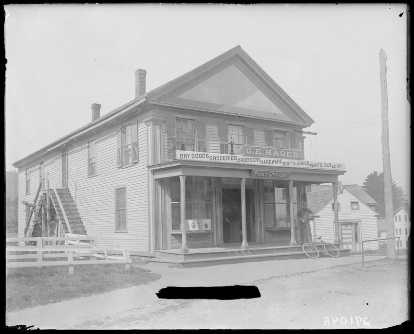 The image depicts the O. E. Hager Store in North Dana, Dana, Massachusetts, which also serves as a post office. The building is a two-story structure with a signboard advertising various goods including dry goods, groceries, crockery, hardware, boots, shoes, paints, and oils. A bicycle is propped ag...
