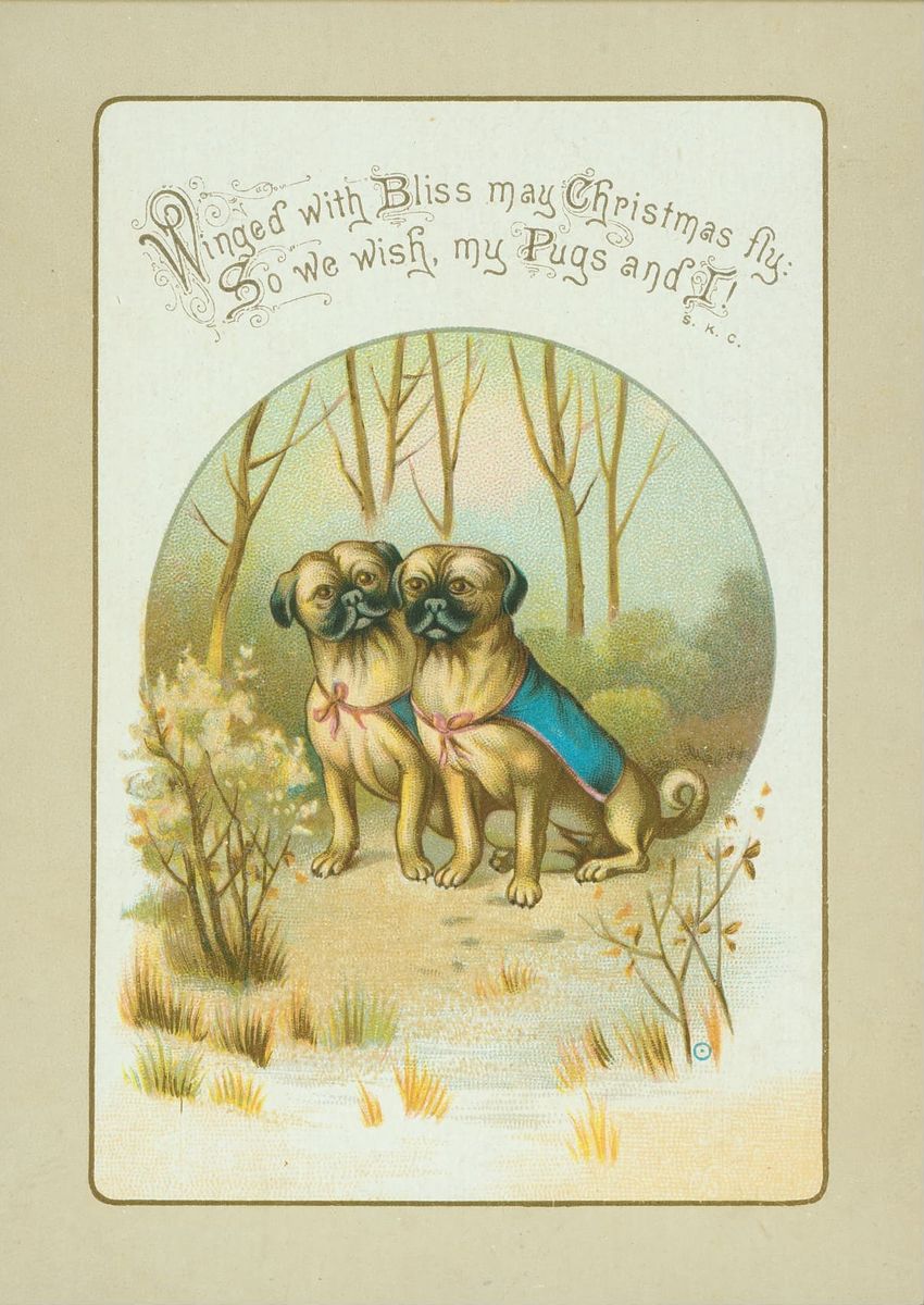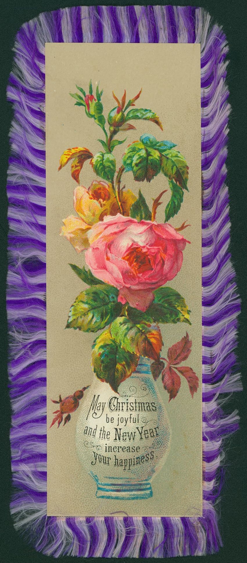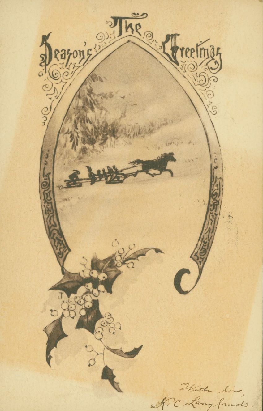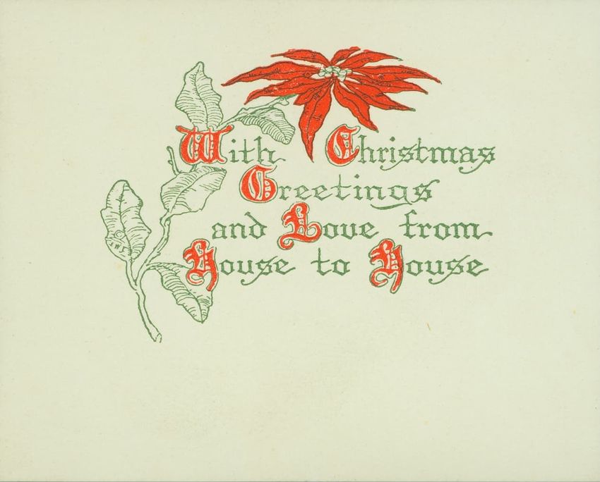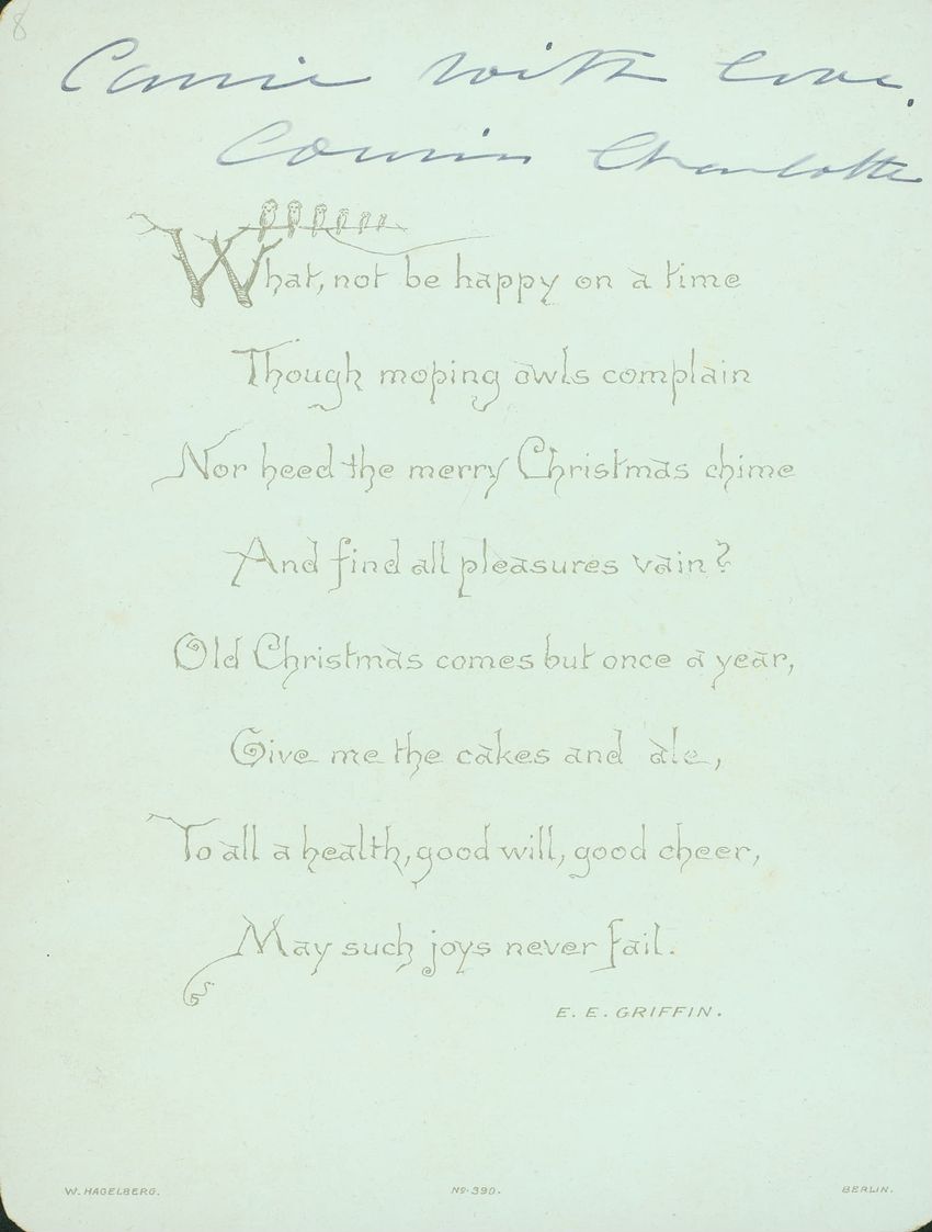 Christmas card with flowers at opposite corners which reads: "Once more a Christmas greeting do I send, This year to thee, my dear and valued friend!" diagonally across. Inscribed on the reverse "With a very Merry Xmas from your loving MRB! 1880"