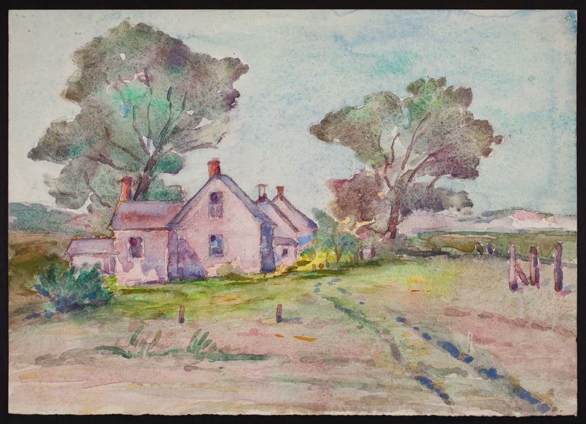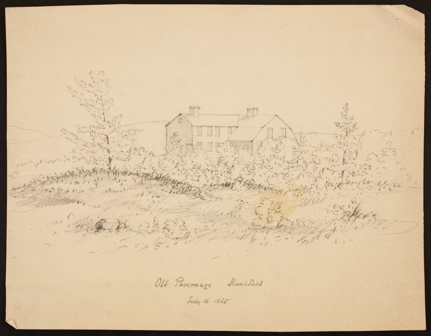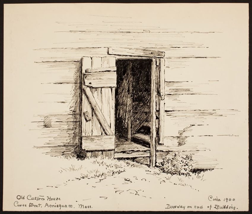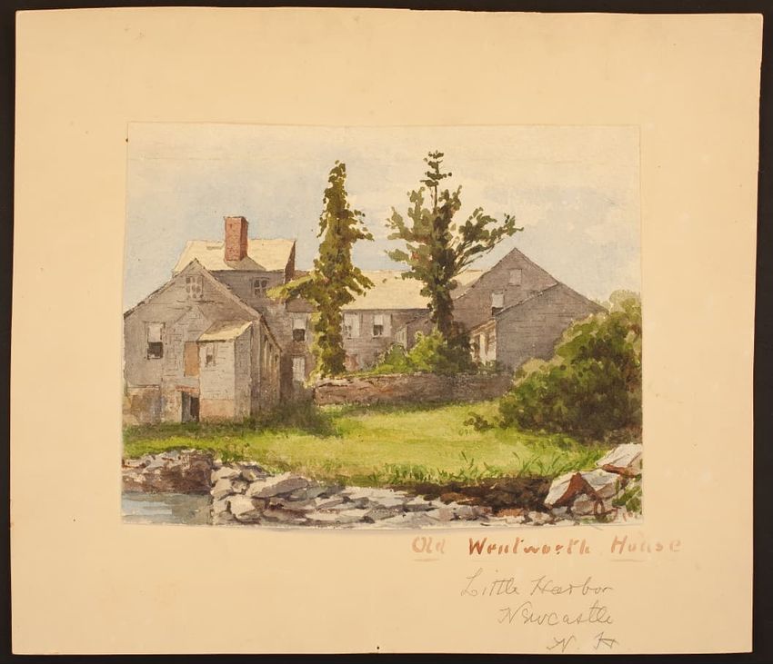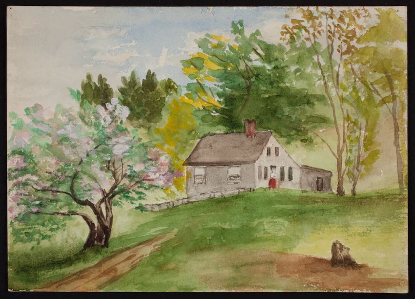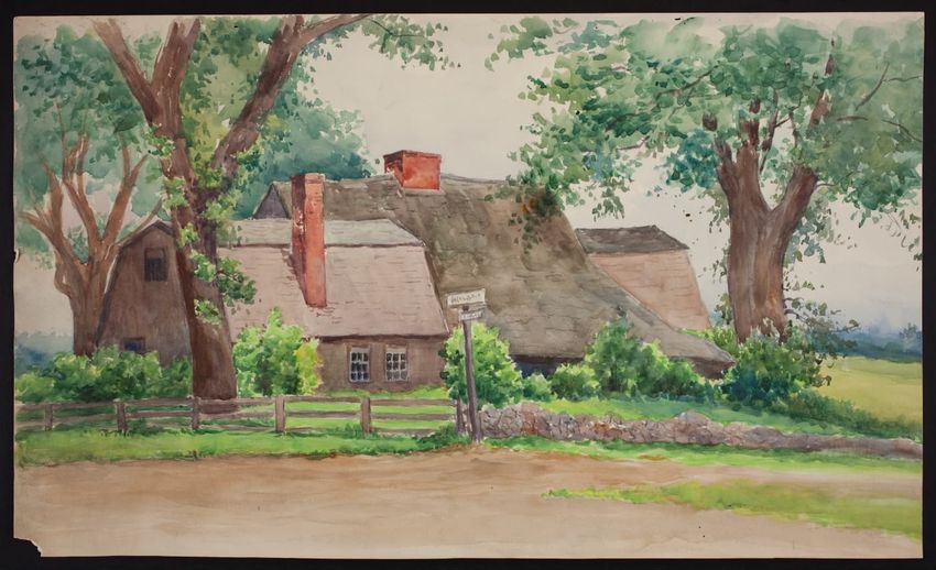 Grays. House, built about 1740, seen from side and front, from street. Other houses across street. Fencing runs around property and down street.
