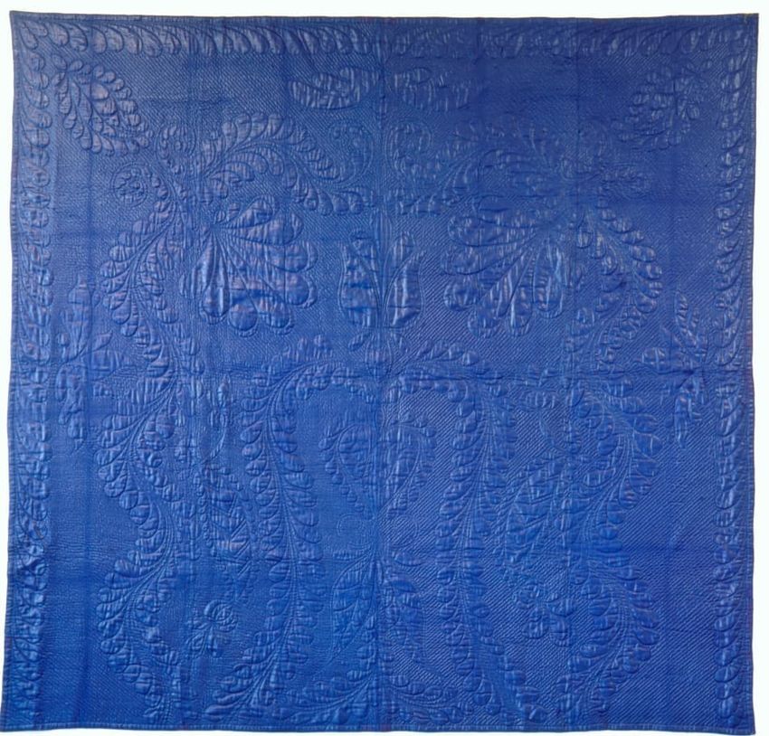 Bedspread/coverlet of nearly square form, comprised of four panels, quilted with centeral tulip over heart embroidered with initials and date "LB 1803" enclosed by scrolled feathering, palmettes, floral sprigs, corner leaves, and three-sided half-feather pattern border with hearts in each corner; gr...