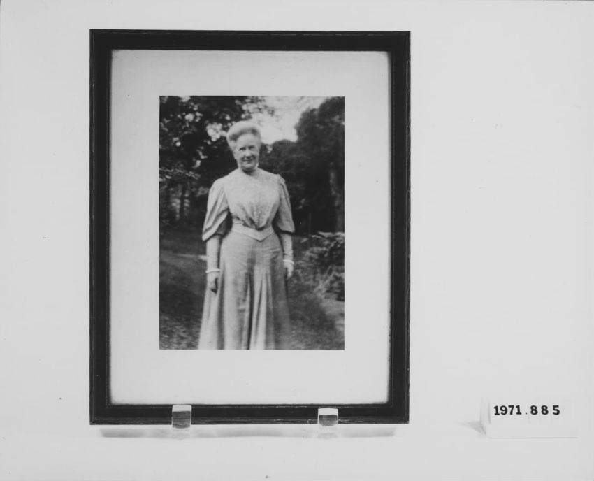 Photograph of Mrs. Mary Ann May (James R.) standing in the garden of the Rundlet-May house; grey wooden frame.