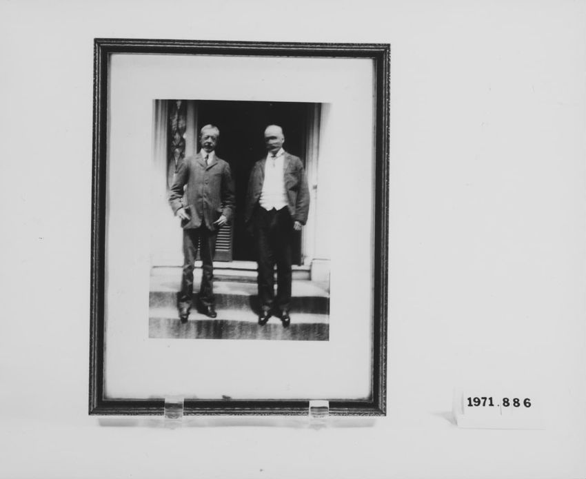 Photograph of James R. May and Elihu Chauncey (right) standing on the front steps of the house; out of focus.
