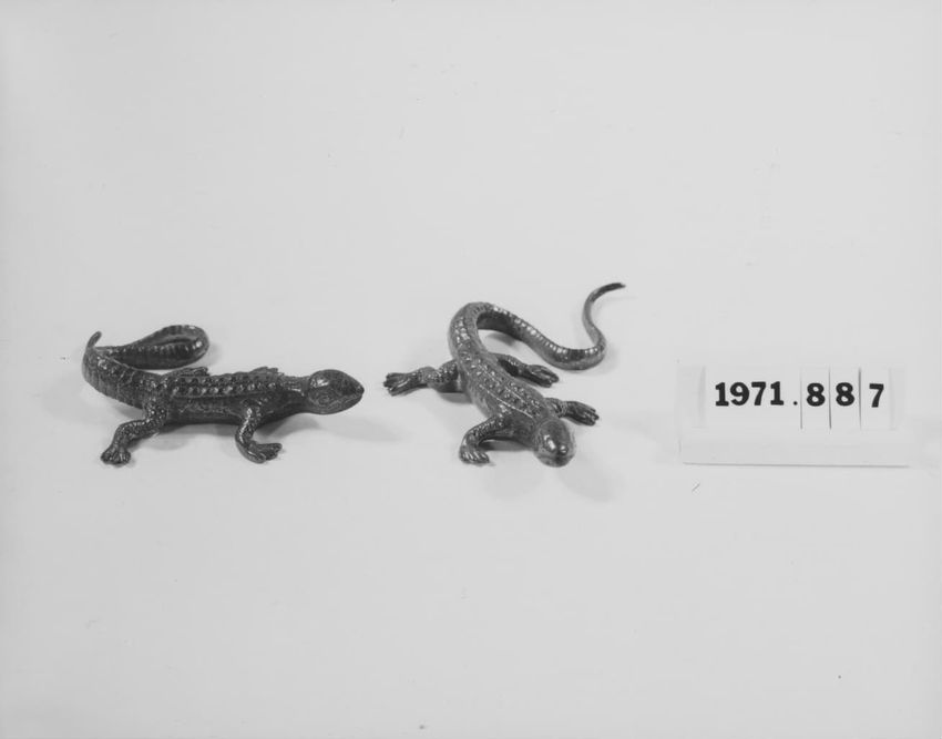 Brass lizards, fully articulated bodies; tail on B is more tightly coiled than on A.
