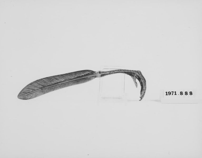 Letter opener in the shape of a bird's feather; grip in the shape of a bird's leg and foot.