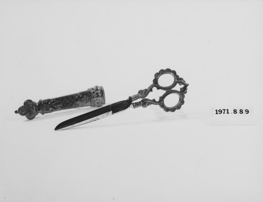 Handle and case decorated with Gothic motifs: trefoil, quatrefoil, a keel arch and bosses.