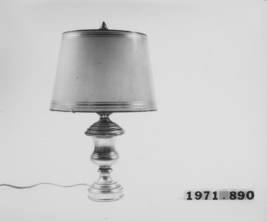 A) Lamp: urnshape, silver colored finish; pineapple finial; painted red and cream. B) Shade: tapered paper cylinder; cream color.