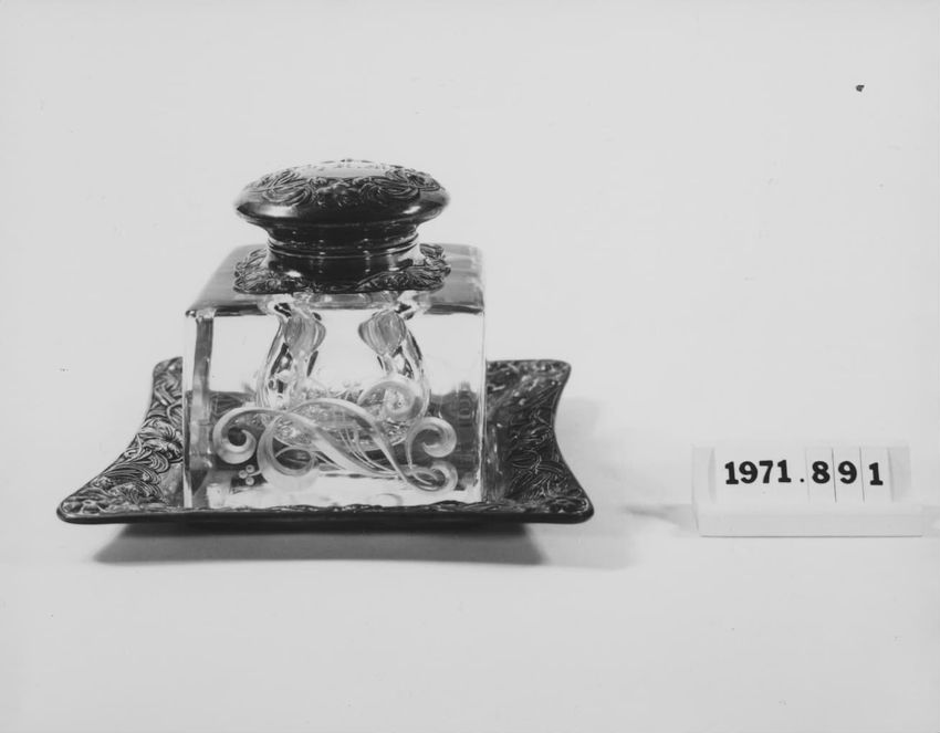 A) Inkwell: square glass block with cut scrolls on sides. B) Lid: removable mushroom-shaped silver cap with stamped art nouveau design. C) Square tray with stamped art nouveau borders.
