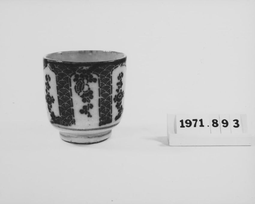 Ring foot; cylindrical body; cobalt blue floral design in reserved panels; used in desk recess.