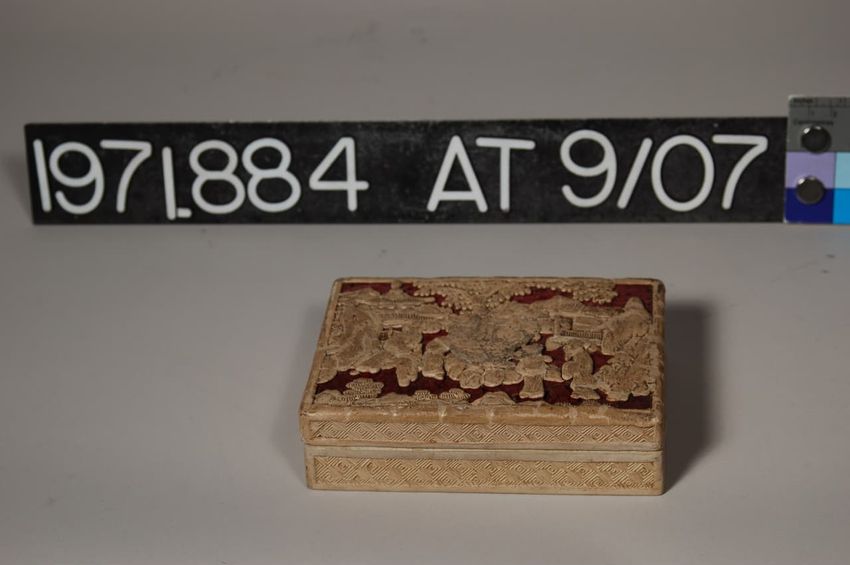 Rectangular; white composition exterior, diaper pattern on sides; figures in a landscape in low relief on top (maroon background).