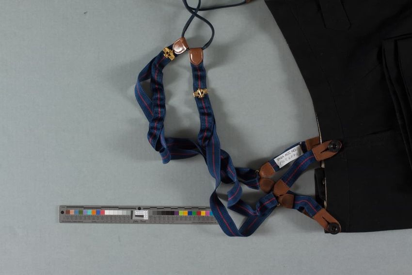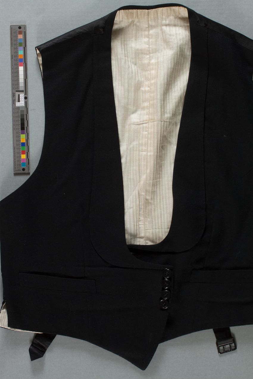 Blue wool; turnover collar with wide lapels, self facing; double-breasted; five pairs of buttonholes, four pairs of buttons; raw edges; padded shoulders, front armseye; one breast pocket, two tail pockets; tails and back are lined with blue silk; no buttons at cuff; sleeves lined with pin stripe cre...