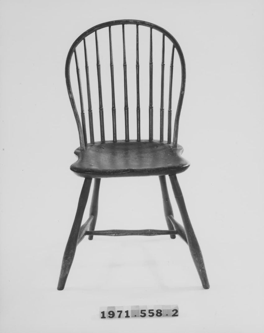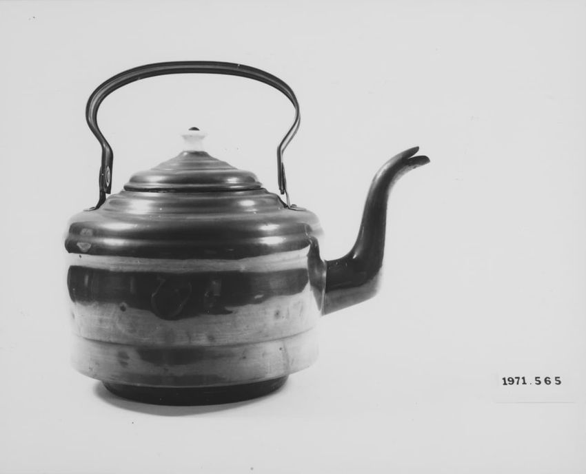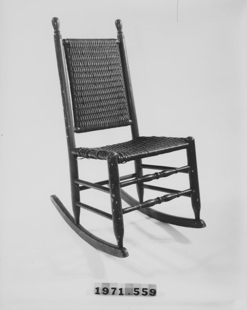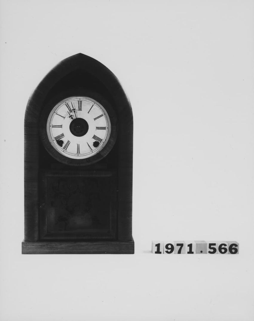 8-day shelf clock; pointed arch form with rosewood veneer sitting on a rectangular block base; circular painted white face with Roman numerals above square open area exposing works; doon is composed of a square, etched and frosted glass panel decorated with image of a Native American, scrolls and ea...