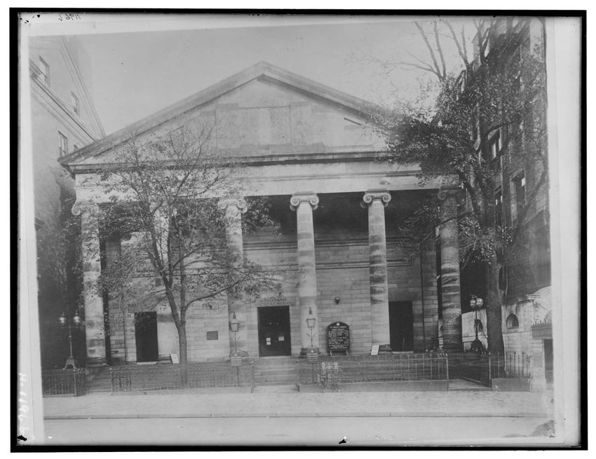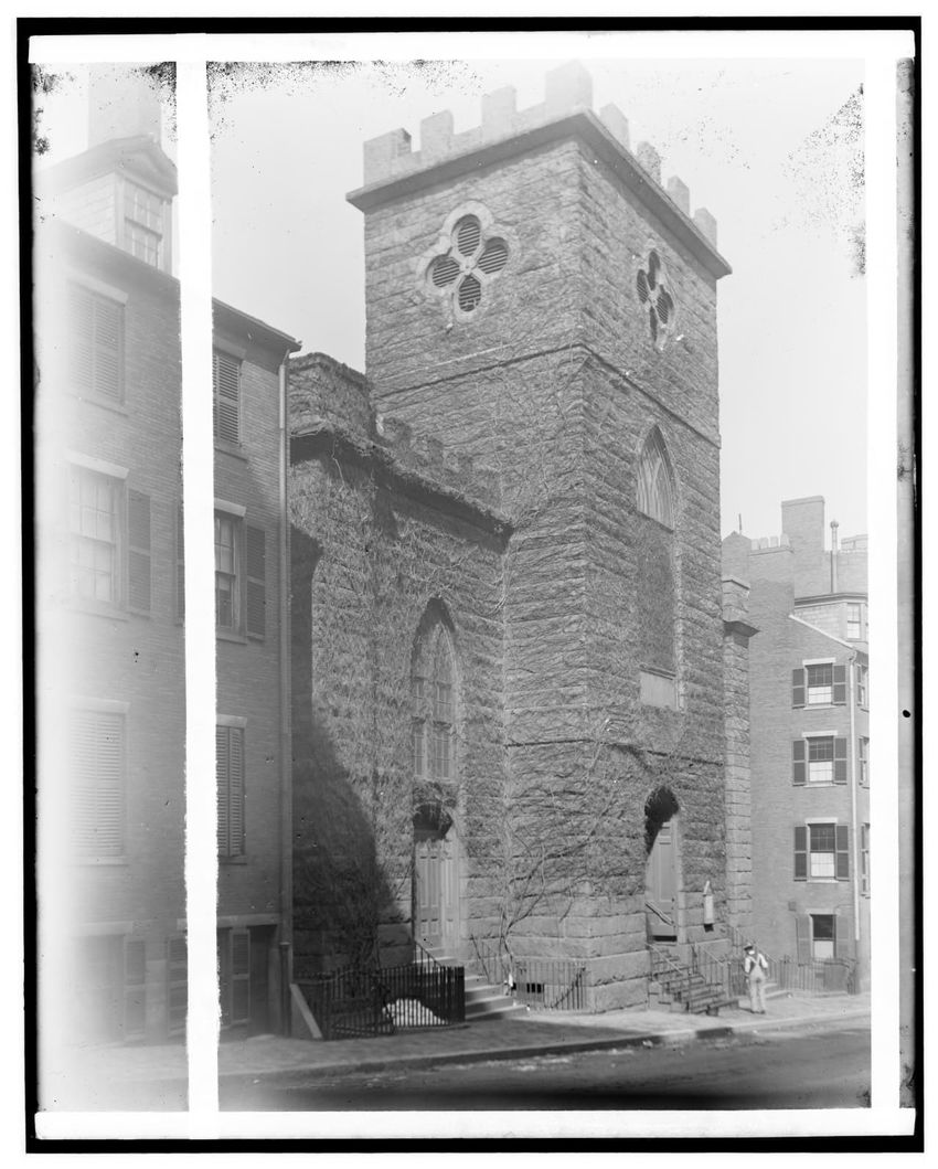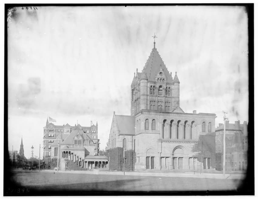 The image depicts Trinity Church located in Copley Square, Back Bay, Boston, Massachusetts. The church's architecture is detailed, featuring a large central tower flanked by smaller towers with peaked roofs. The facade includes arched windows and ornate detailing, with ivy covering part of the struc...