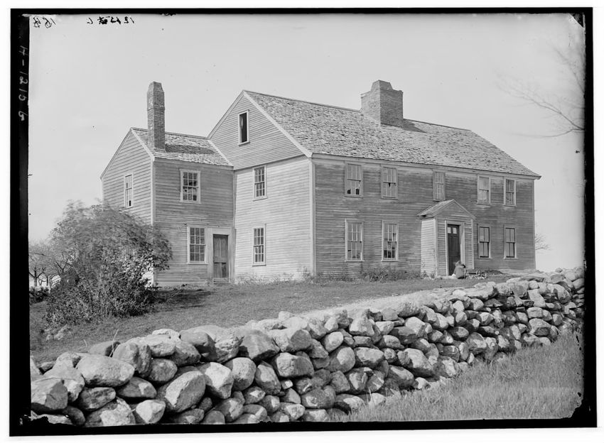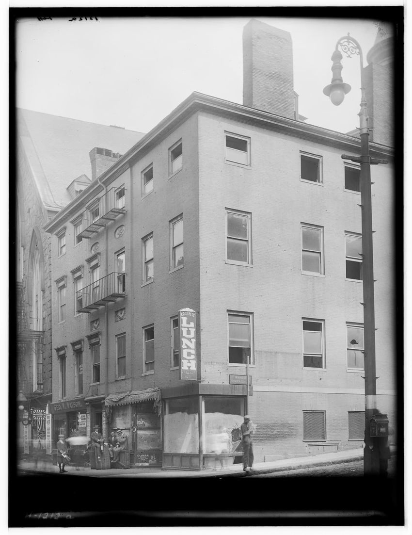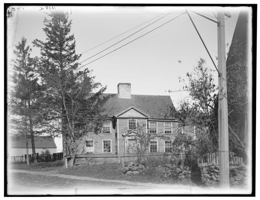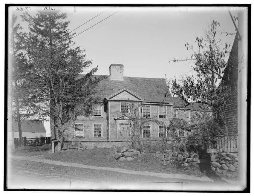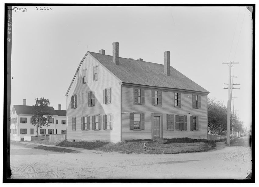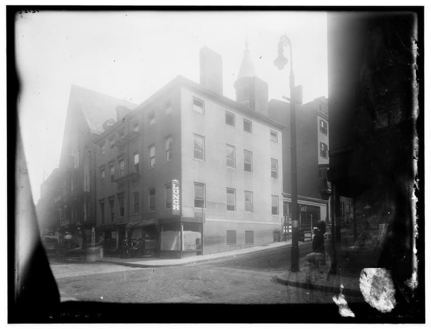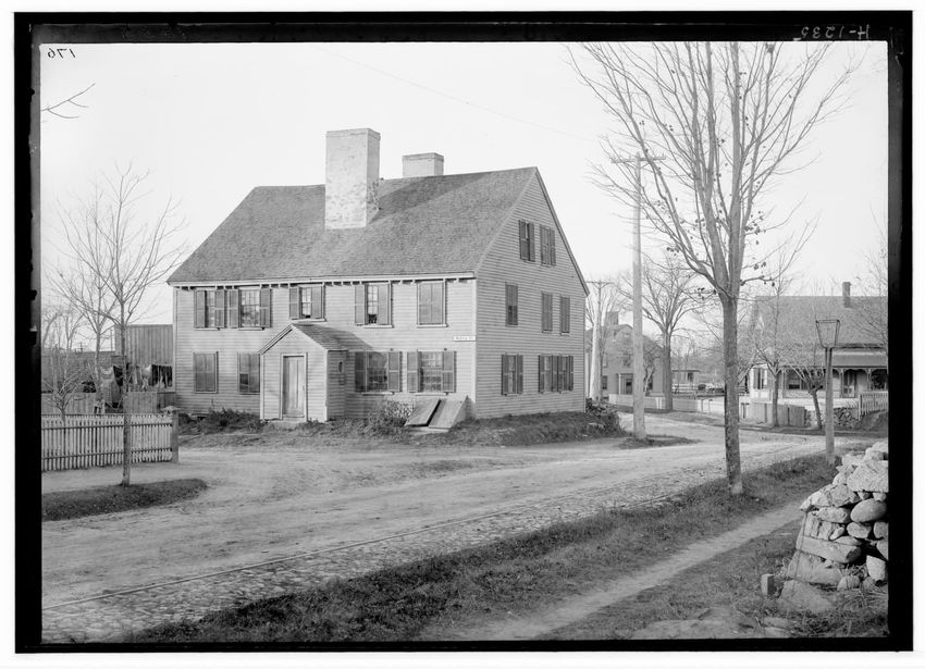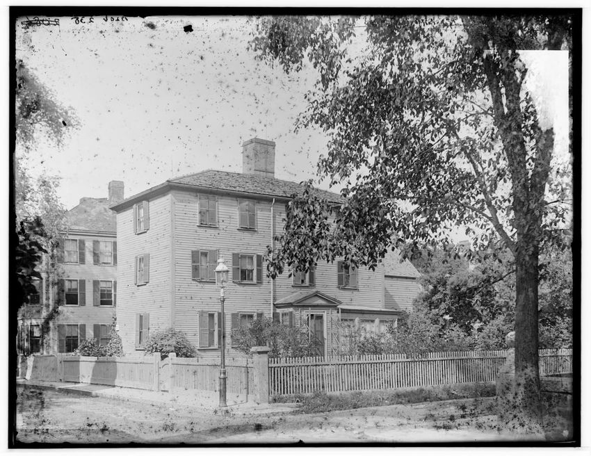 The image depicts the Dellaway House, a three-story brick building located on a corner in Boston, Massachusetts. The house is surrounded by a metal fence and a cobblestone street is visible in the foreground. Adjacent buildings, including one with the number "181" displayed on the window, are also s...