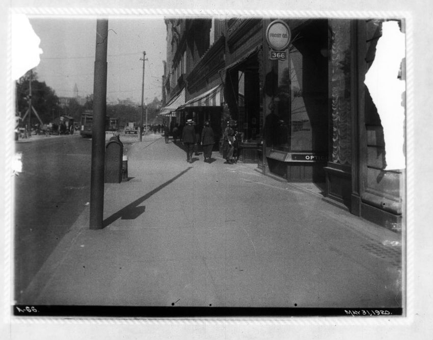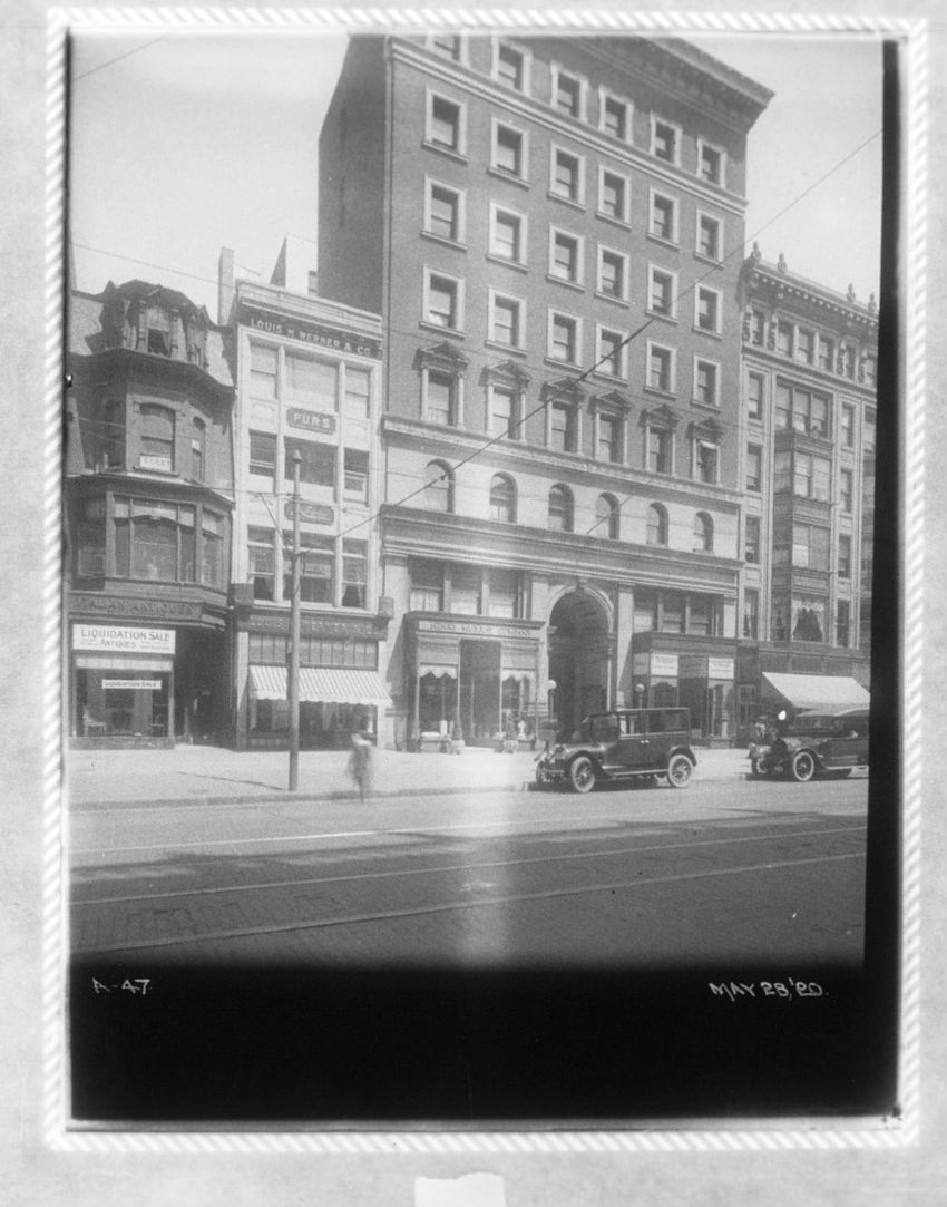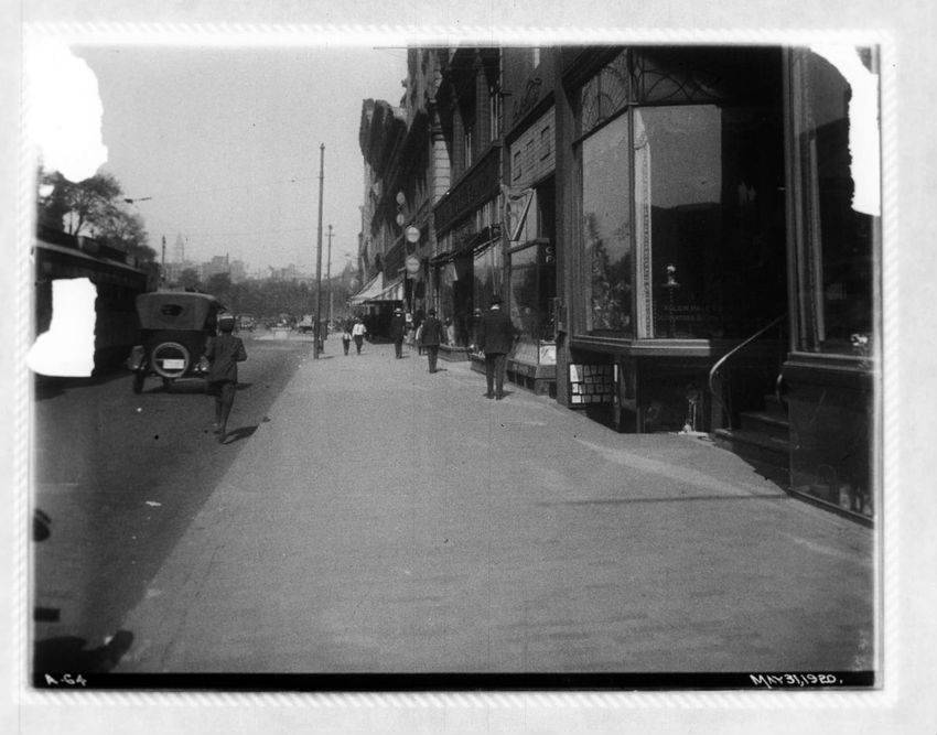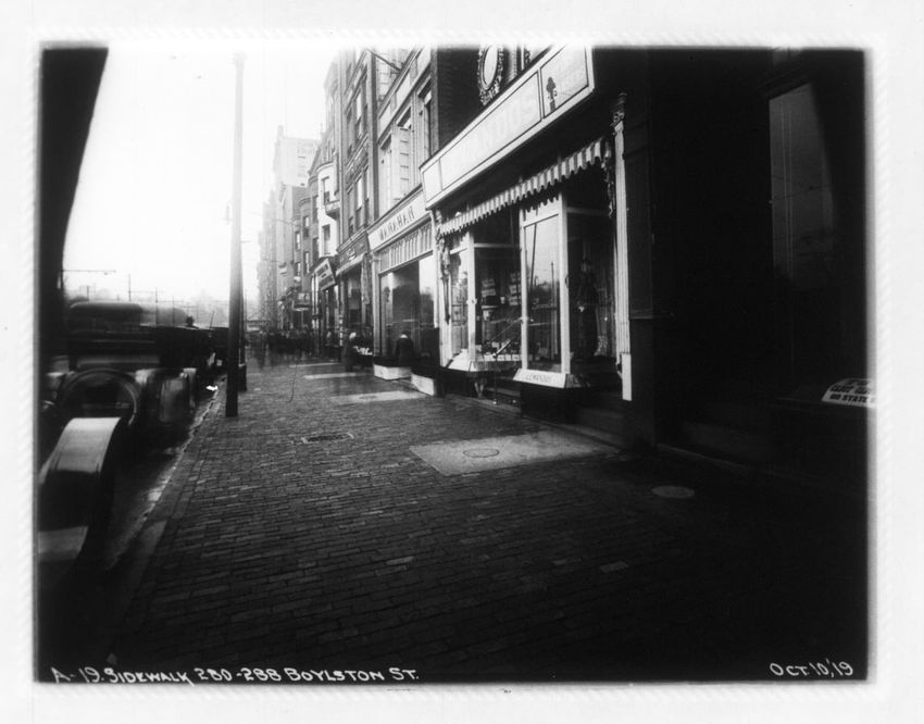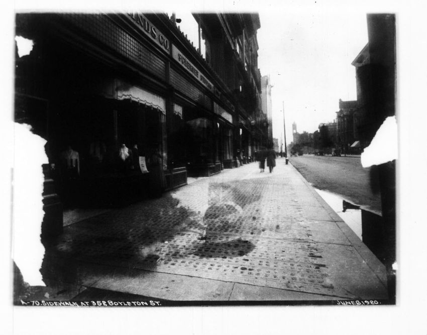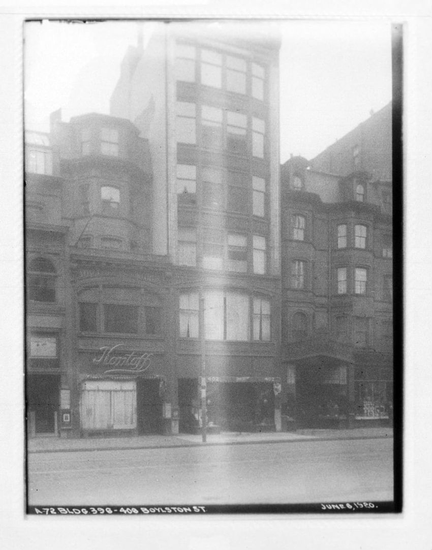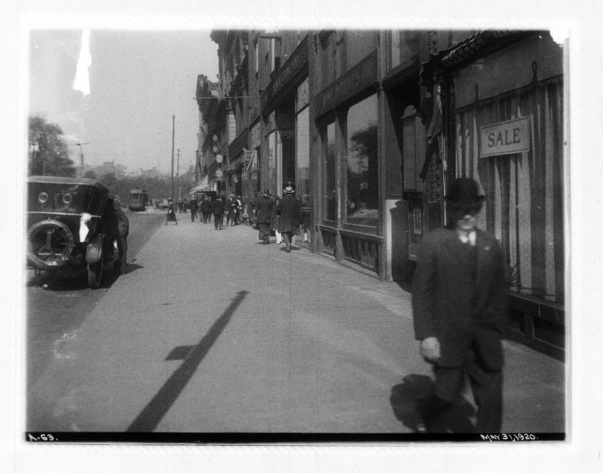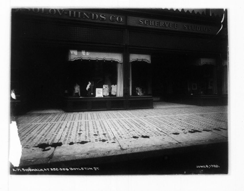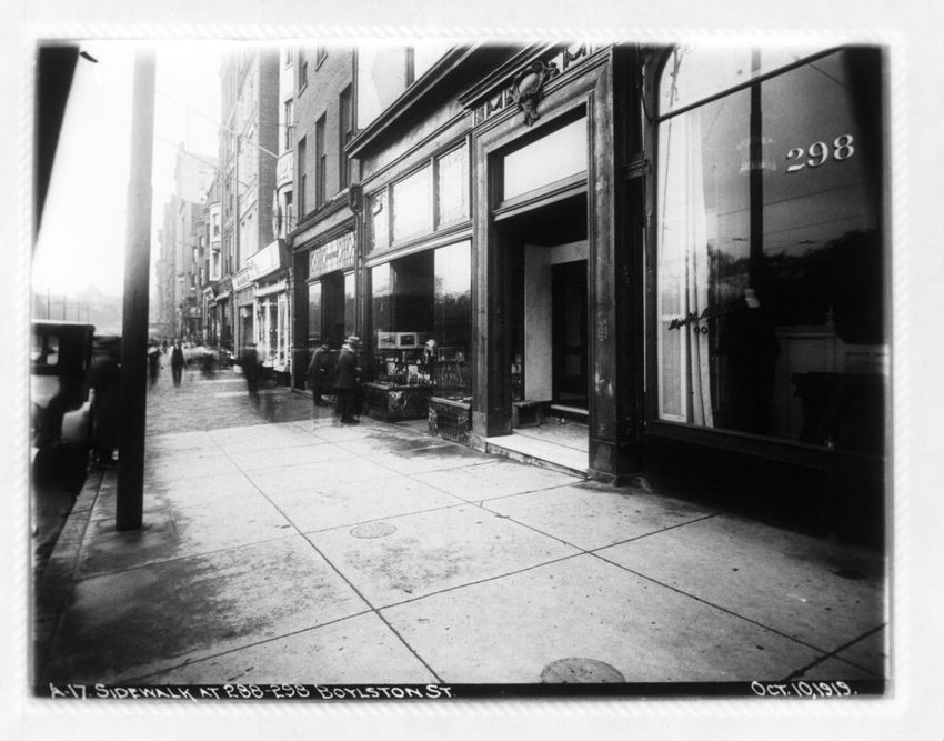 The image looks in the direction of Copley Square with the Old South Church on the right side. On the left side of the image is Solov-Hinds, a ladies outfitter and the Schervee Studios, an interior decorating and photography business.