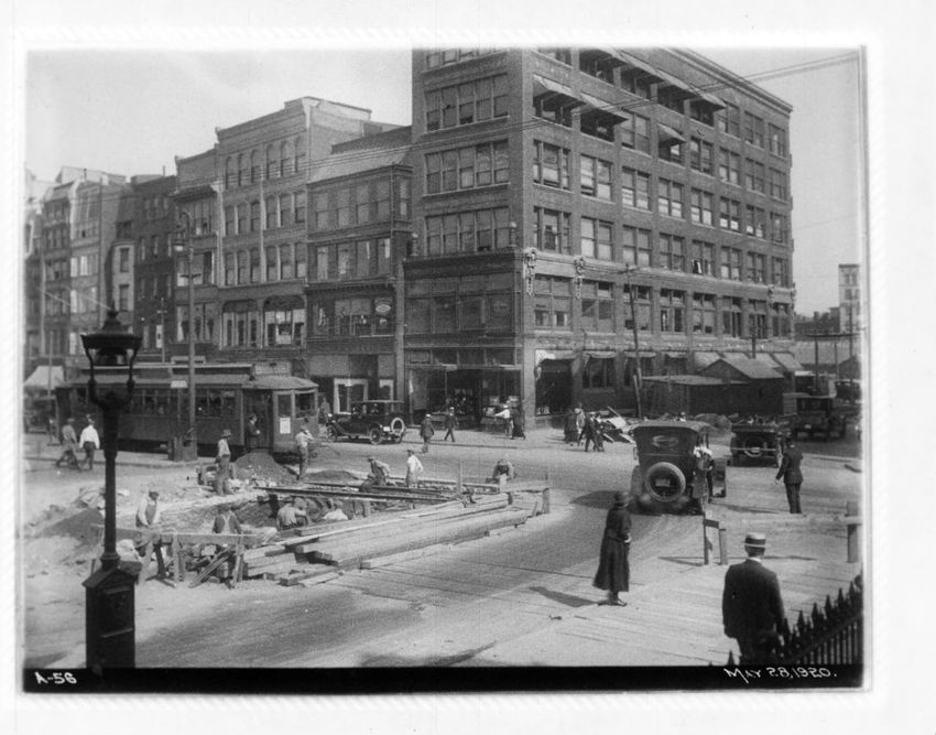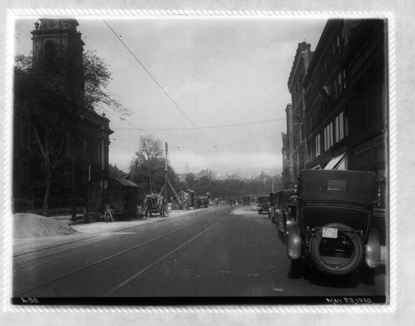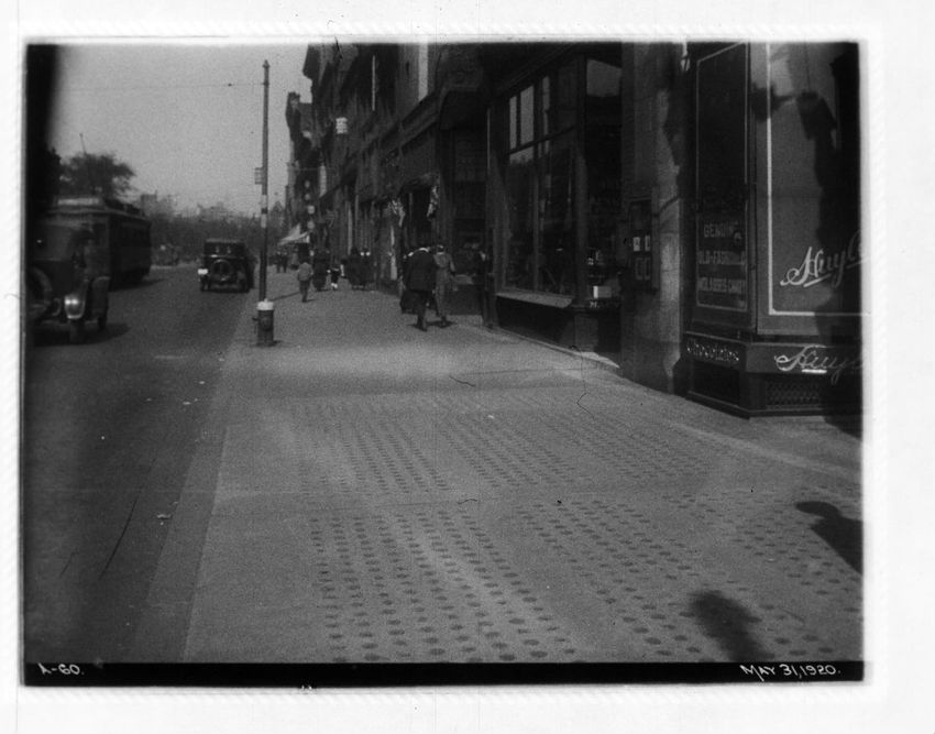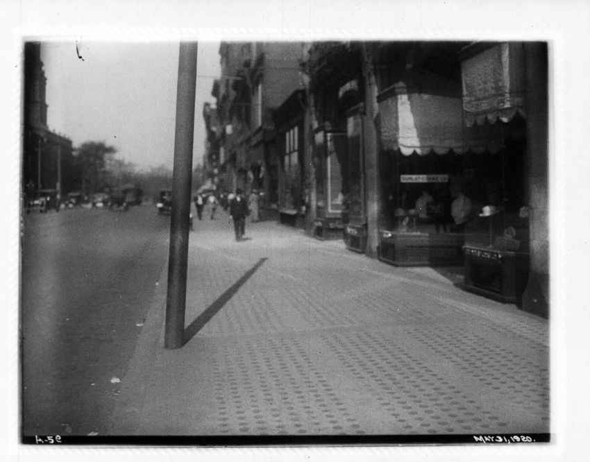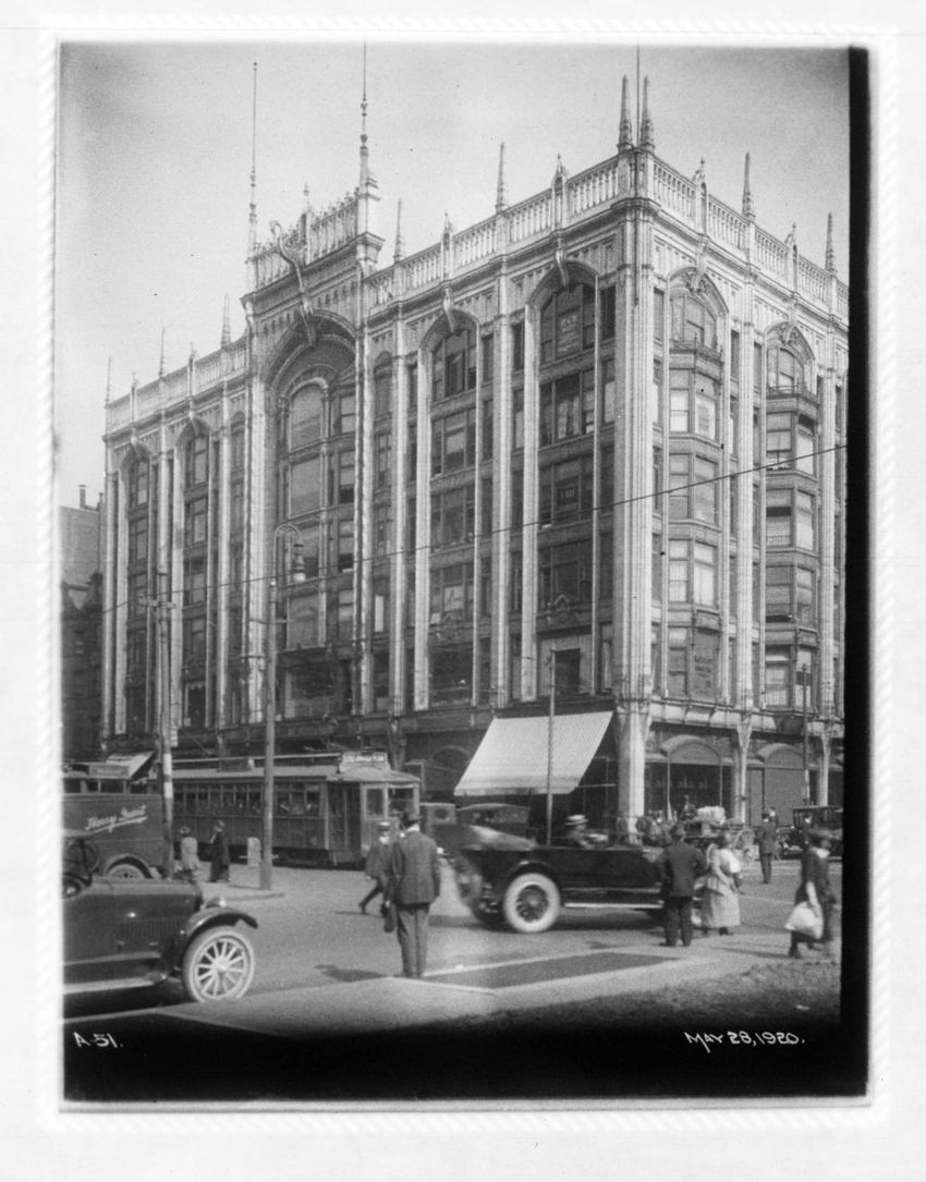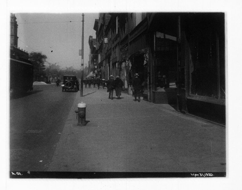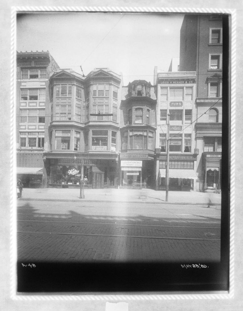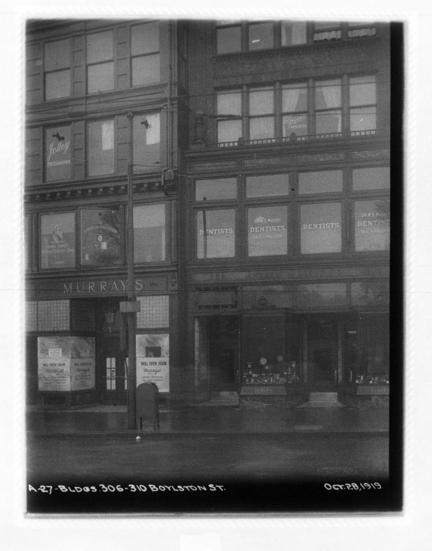 The image looks in the direction of Copley Square with the Old South Church on the right side. On the left side of the image is Solov-Hinds, a ladies outfitter and the Schervee Studios, an interior decorating and photography business.