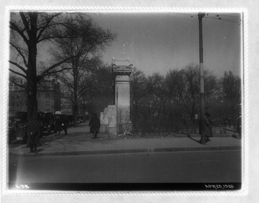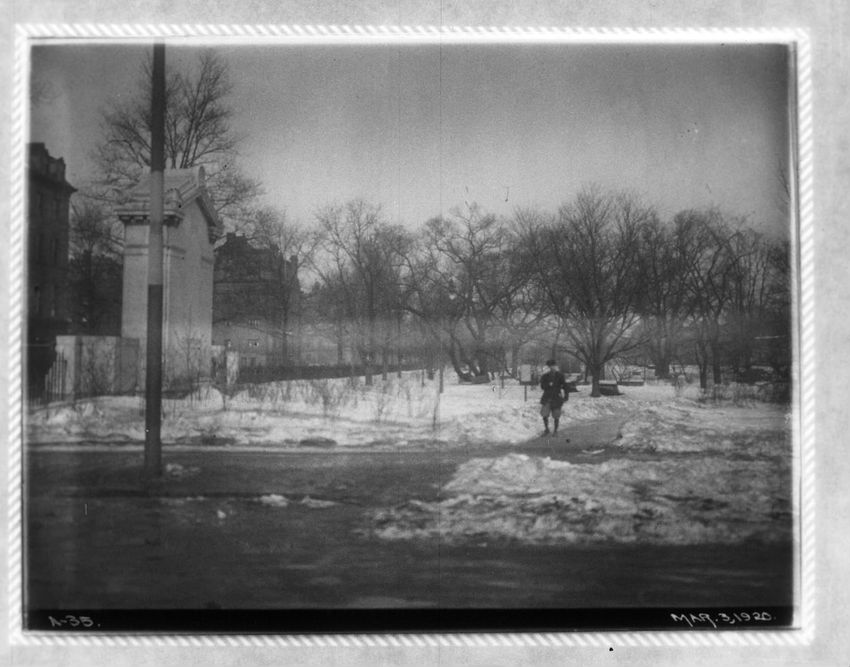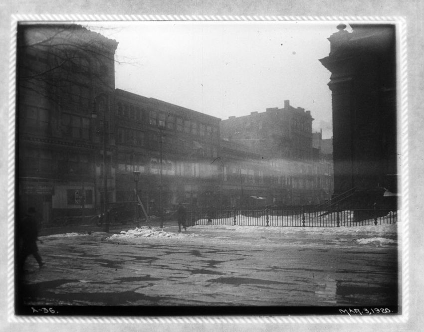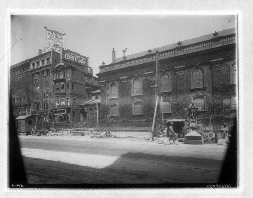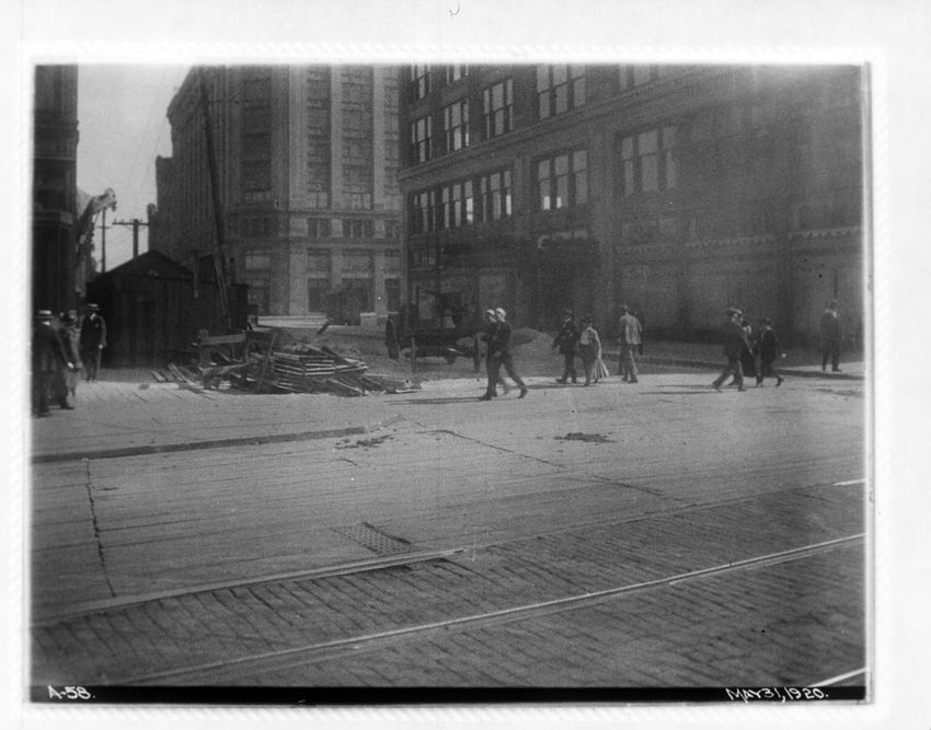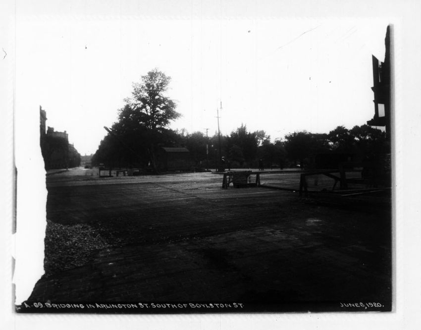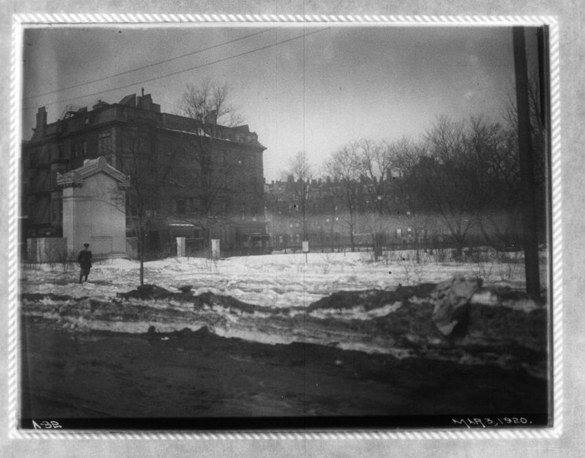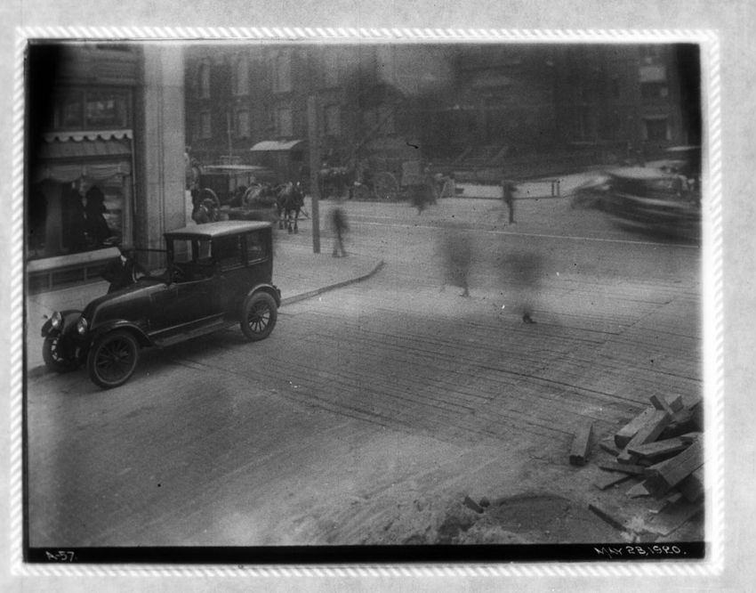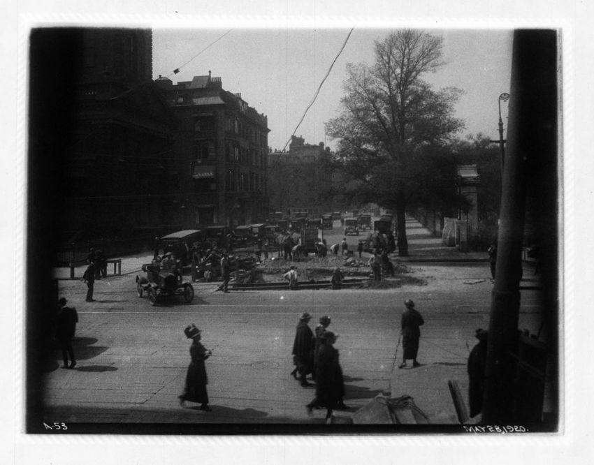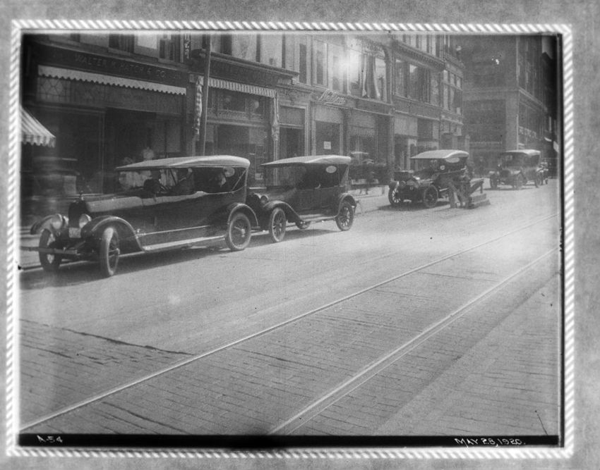 The image looks in the direction of Copley Square with the Old South Church on the right side. On the left side of the image is Solov-Hinds, a ladies outfitter and the Schervee Studios, an interior decorating and photography business.