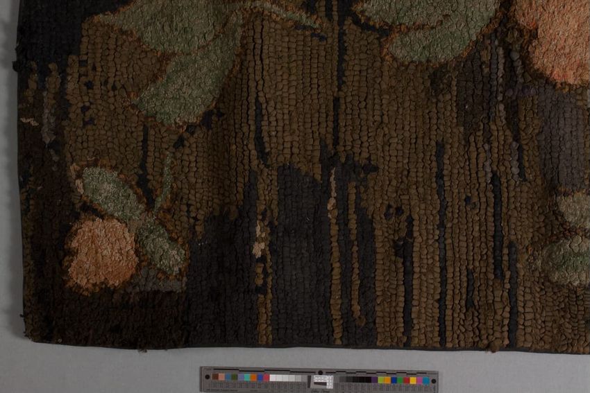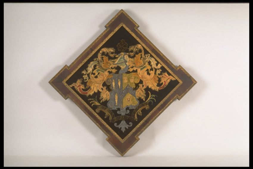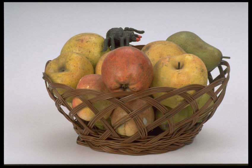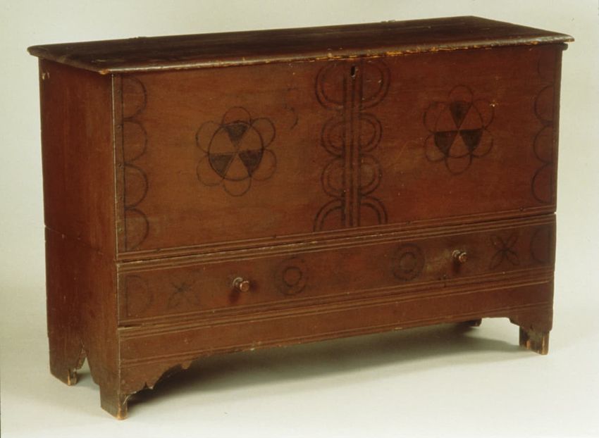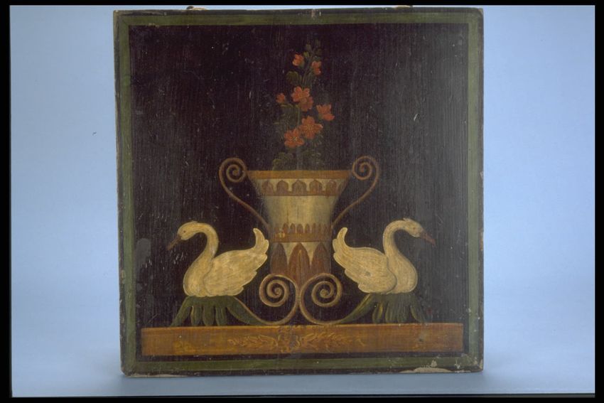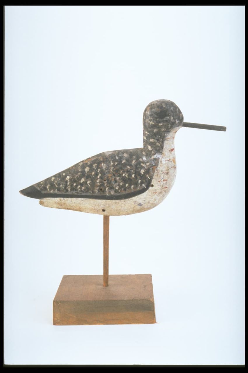 Theorum painting in two small square format, pigmy curlew (or curlew sandpiper) standing in blue puddle seen facing right in profile. Has a white underbody, brown, barred wing and tail, black eye, long, stright bill. Box, walnut (?) frame, glazed. Scalloped decoration and main forms filled in wit...