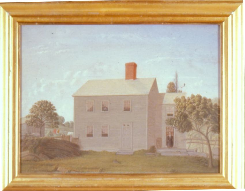 Rectangular, vertical format, full-length portrait, in pencil and crayon, of Lyman S. Hapgood as a child, showing him in a left profile view, sitting in an old-fashioned high chair posed with the sea and a sailboat in teh background. The child wears a broad-brimmed straw hat with wide blue ribbon, a...