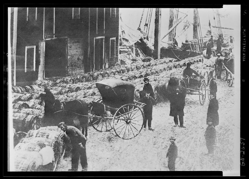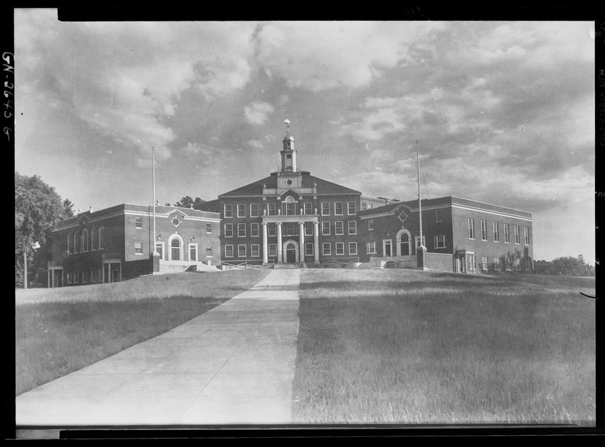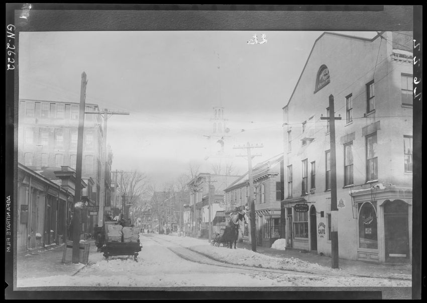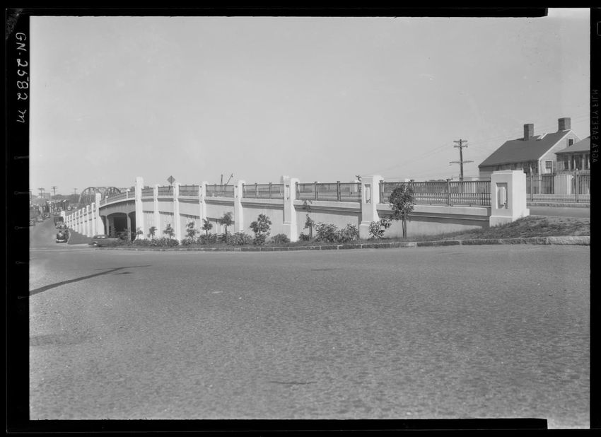 The image shows a street scene featuring a newly constructed highway. In the foreground, a man stands next to a car on the left side. A sign on the left reads "McKinney's Newsstands, Tobacco, Confectionery, Jersey Ice Cream." Houses and trees line the background, and a person is visible near one of ...