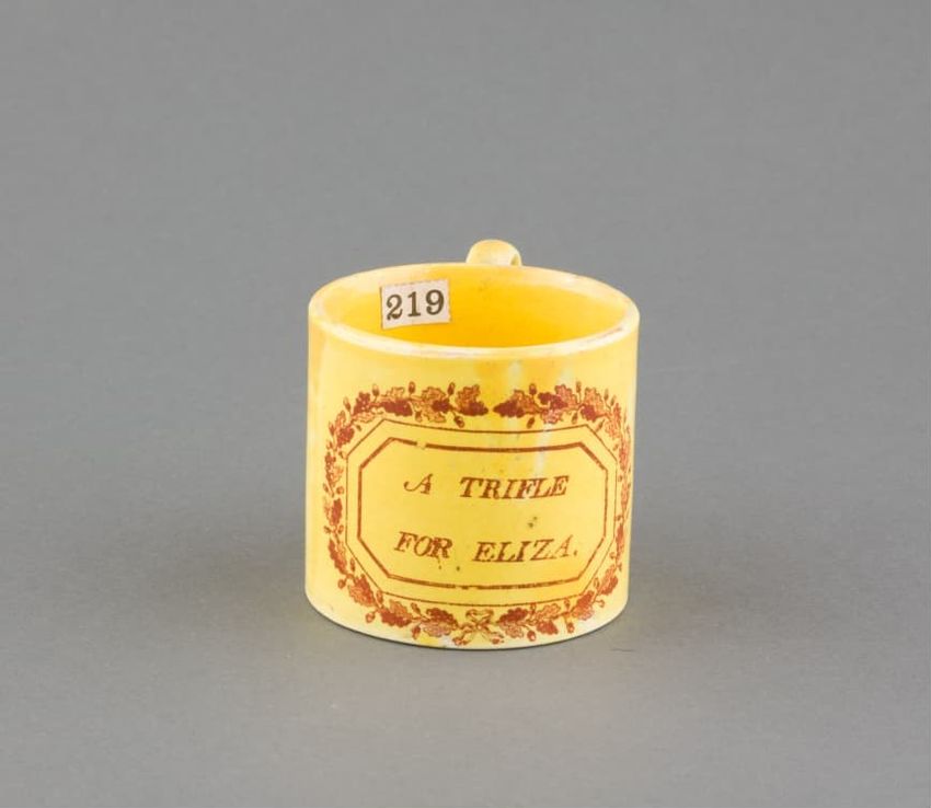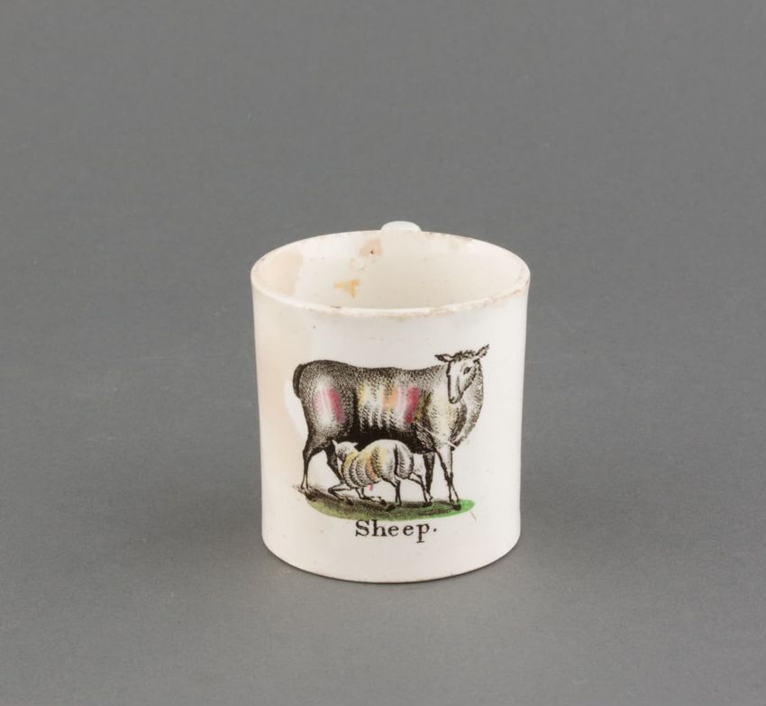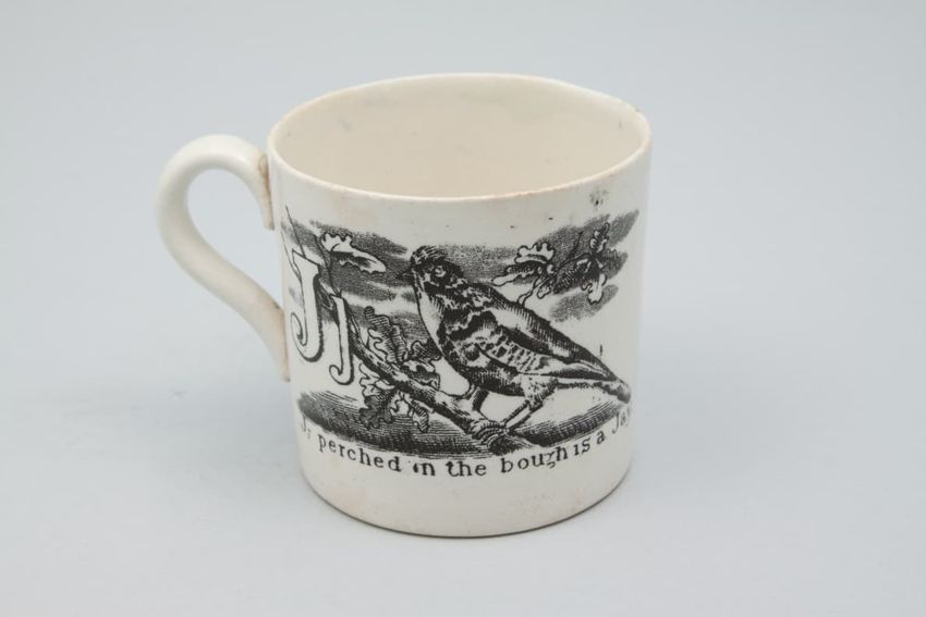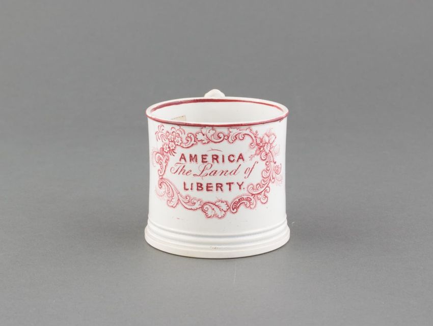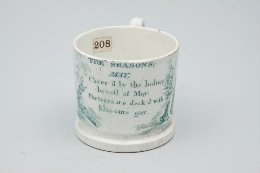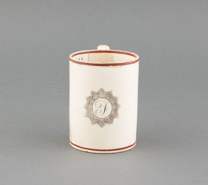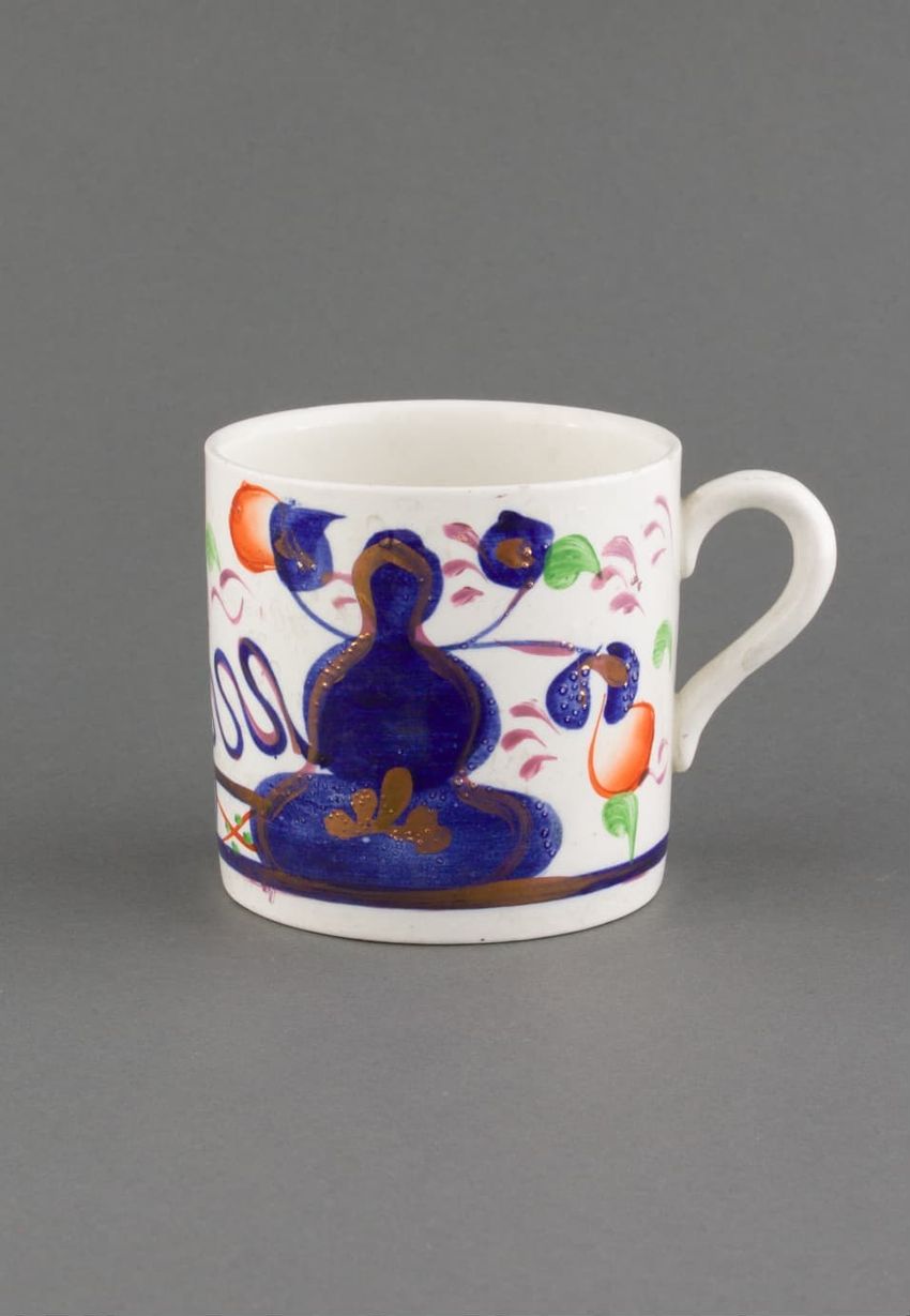 Earthenware mug. Cylindrical with loop handle. Painted with a variety of floral, fruit, and geometric motifs. A silhouette figure suggestive of a person sitting cross-legged. Colors include blue, green, purple, orange, and red. Accented with gold luster. Red line down handle.