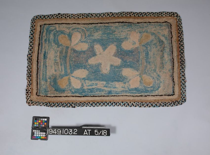 Vertical sampler, natural linen ground. Alphabet sampler with lines divided by rows of cross stitching. Polychromatic. Alphabets: #1 missing "J", "U"; #2 missing "J", "U", double letters(AA,BB); #3 "A-Q" missing "J"; #4 "A-S missing "J"; #5 missing "J", "U"; cross stitch, eyelet hole.