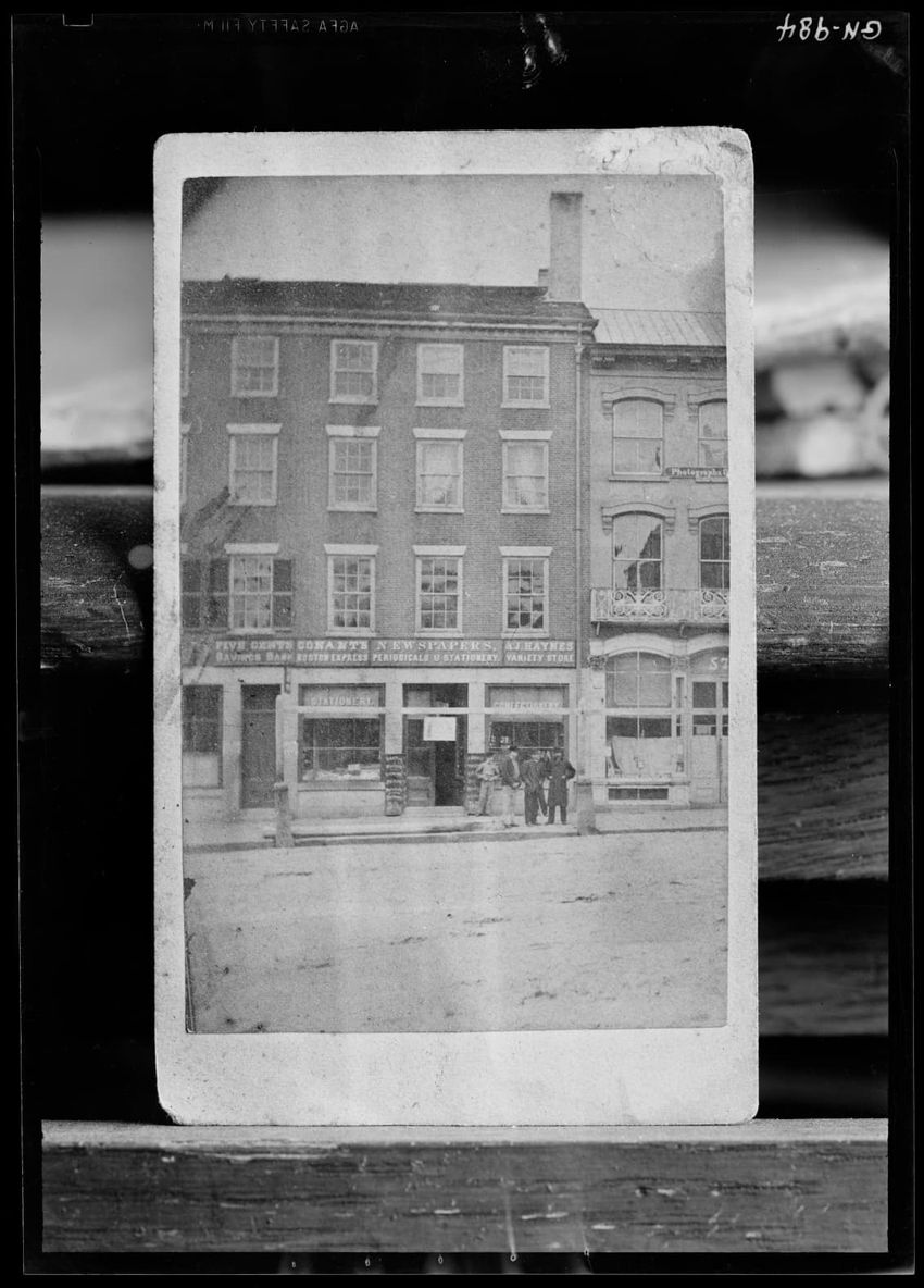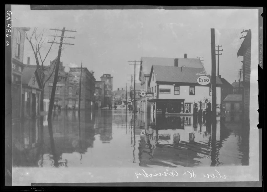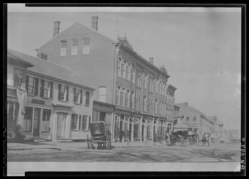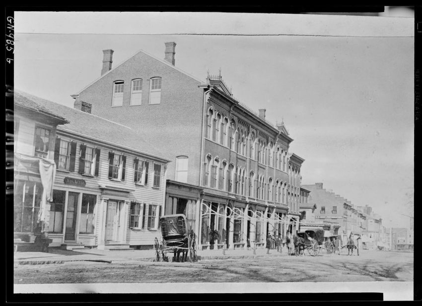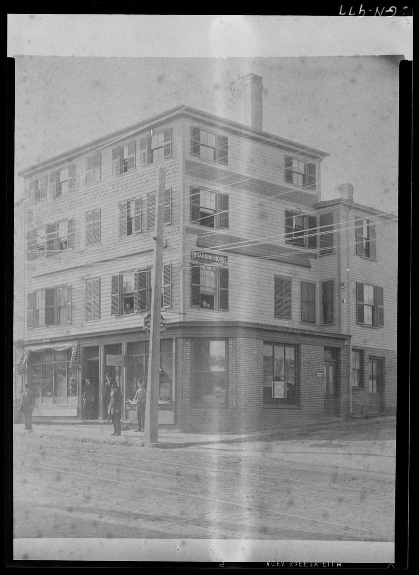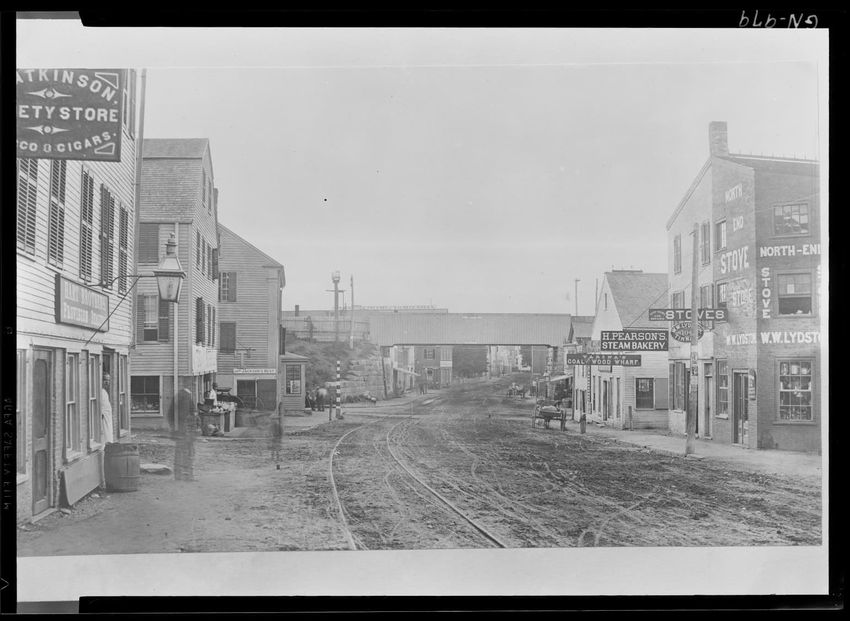 The image depicts Inn Street in Newburyport, Massachusetts. It shows a dirt road lined with various two-story buildings featuring signs for different businesses. Visible signage includes "Swan Job Printing," "Morning Herald Leader," "Prof. Baptiste Ladies & Gents Boot Black Parlor," and "Steam Laund...