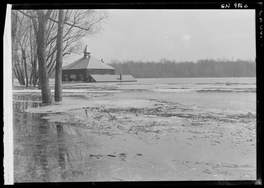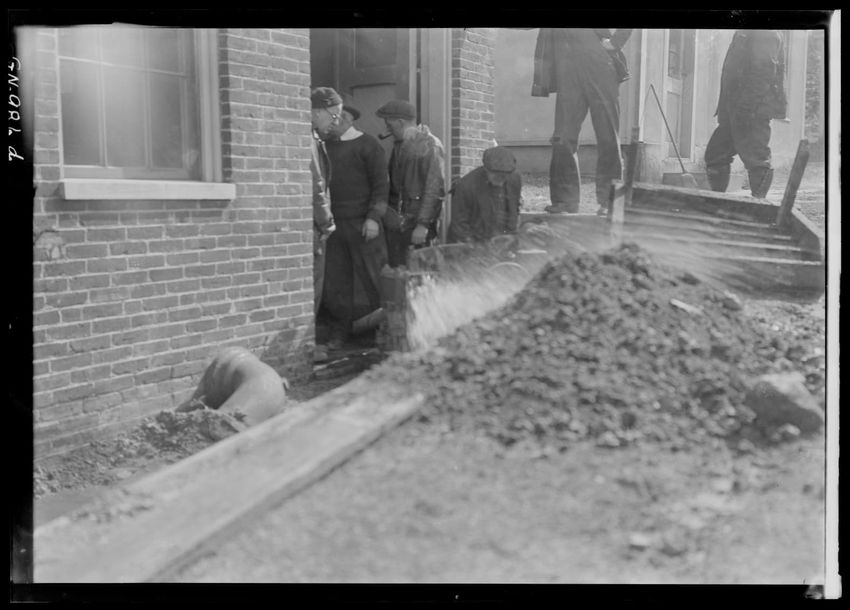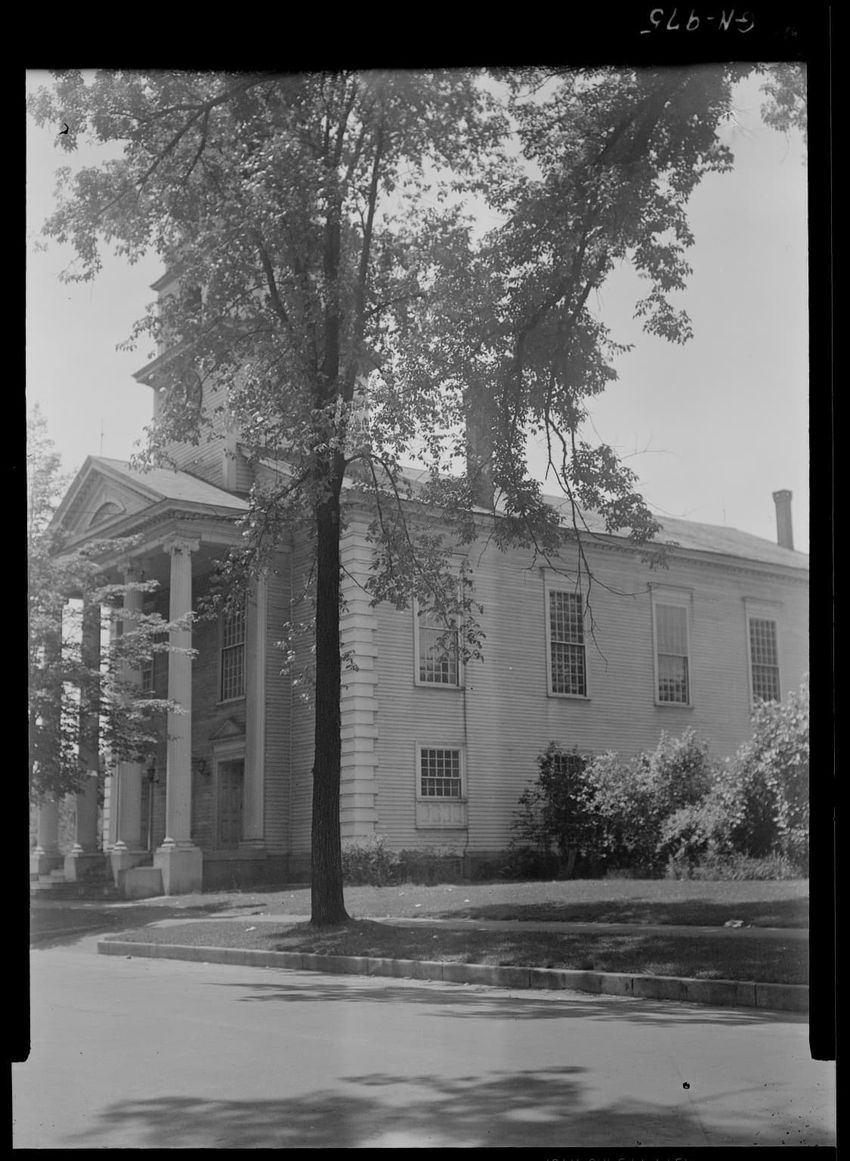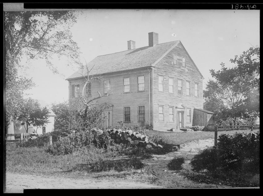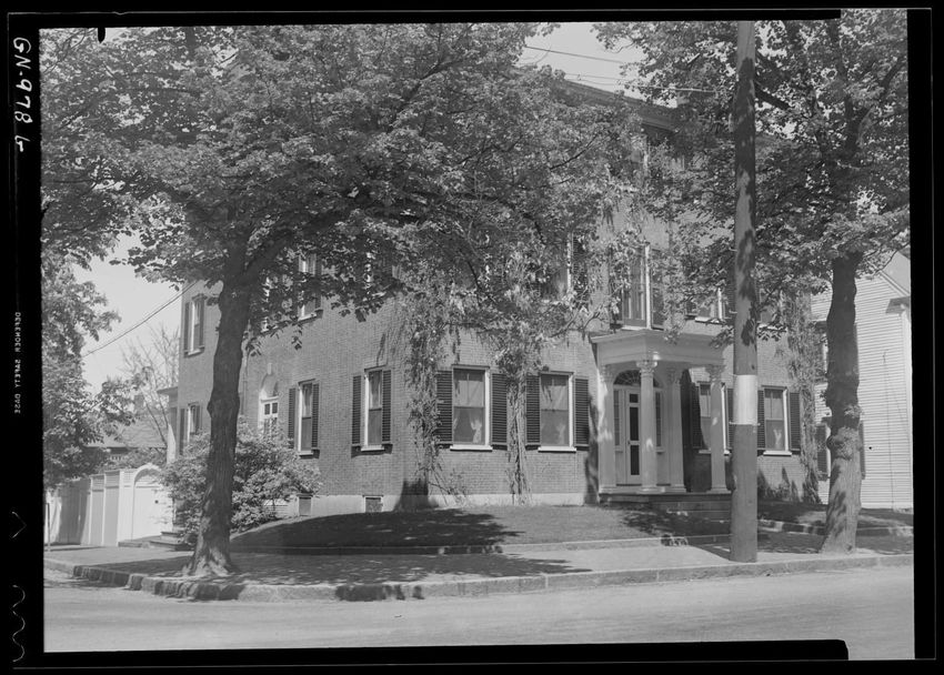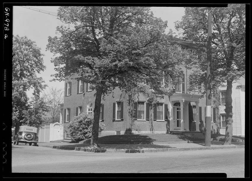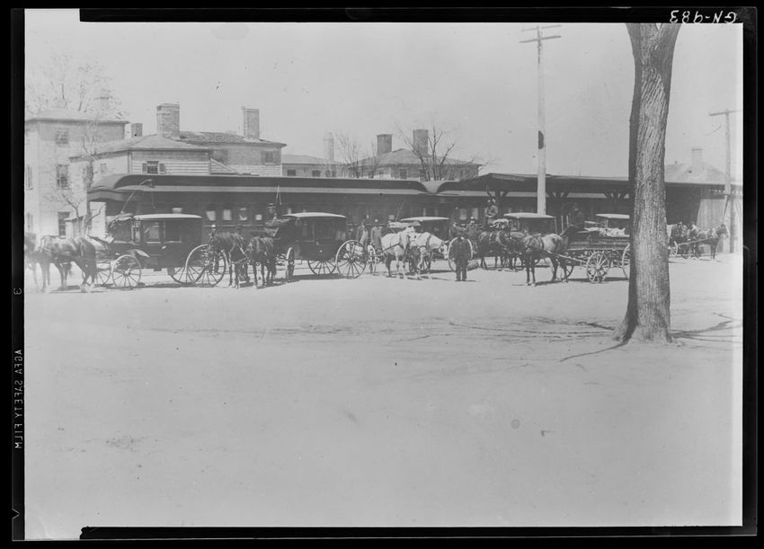 The image depicts Inn Street in Newburyport, Massachusetts. It shows a dirt road lined with various two-story buildings featuring signs for different businesses. Visible signage includes "Swan Job Printing," "Morning Herald Leader," "Prof. Baptiste Ladies & Gents Boot Black Parlor," and "Steam Laund...