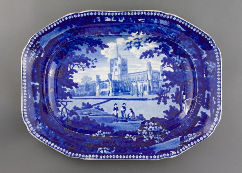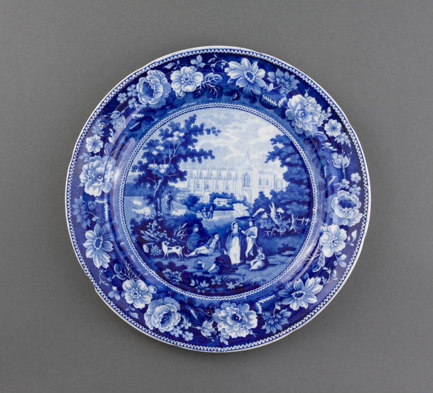 Porcelain teacup and saucer with Imari design. Cobalt blue, orange and gilt design leaves, flowers, and tendrils and abstract motifs on white background, in three reserves outlined in gilt, separated by gilt leaf sprays and pendant flowers on cobalt blue background. Gilt on outside of c-scroll handl...