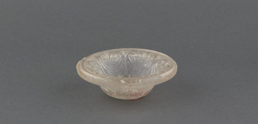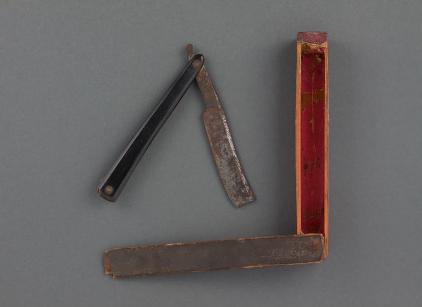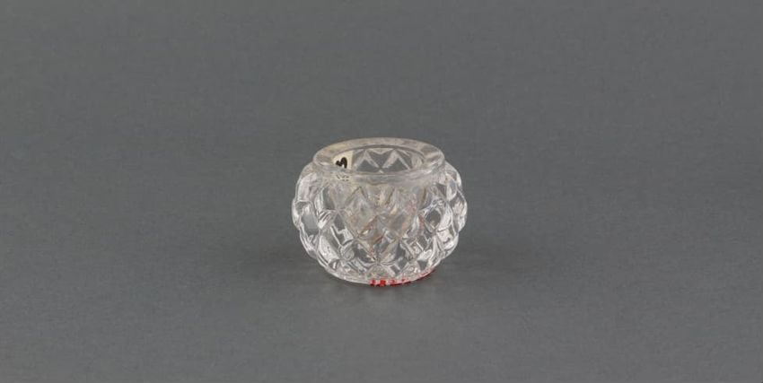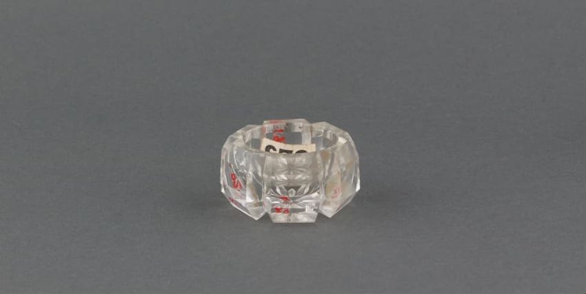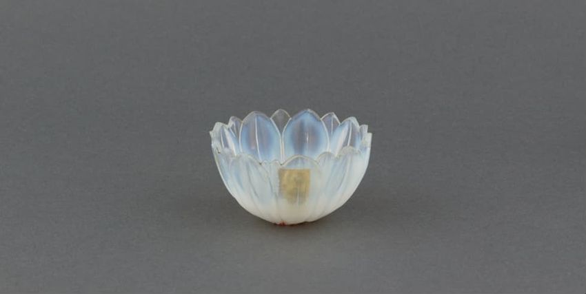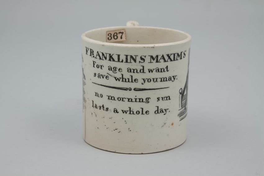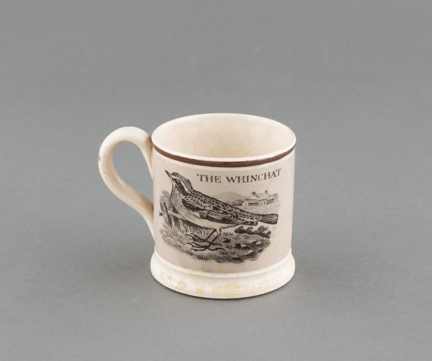Porcelain children's mug. Purple transfer printed image of bucolic landscape with three-story house, gazebo at far right, and small animals in foreground. Silver lustre bands at rim, beneath rim inside, around base, and stripe down handle.
