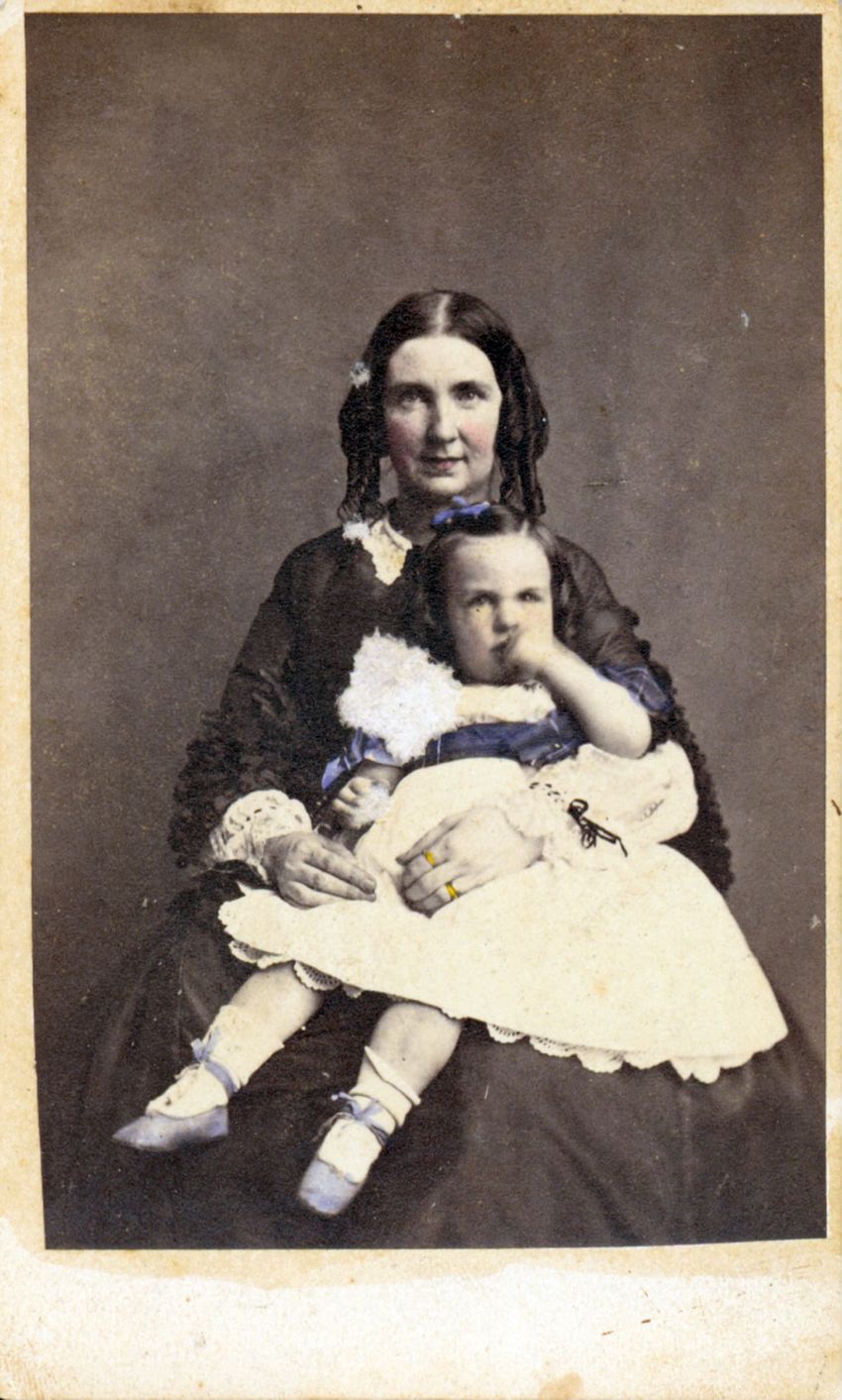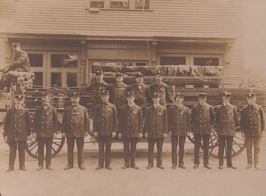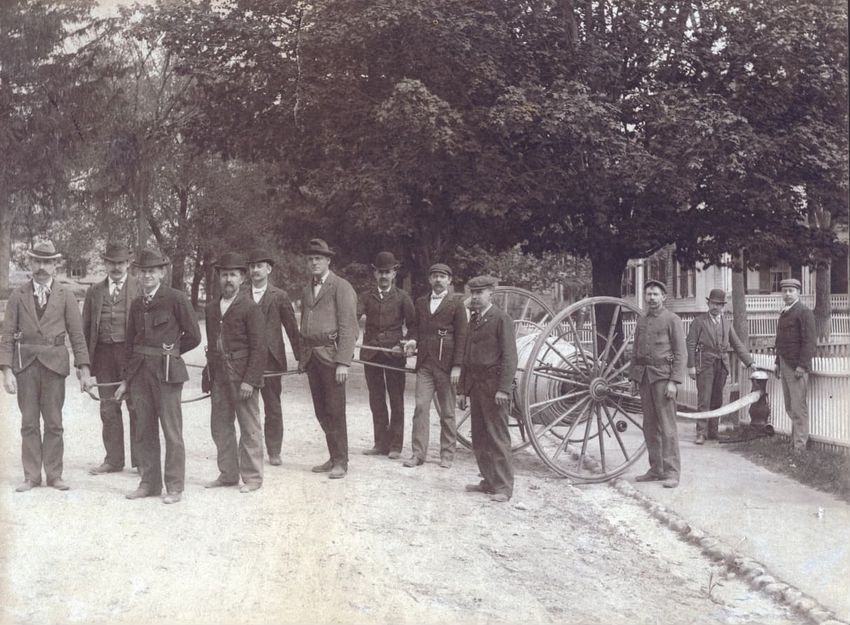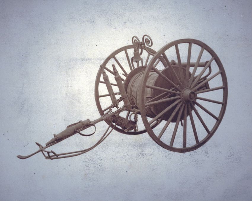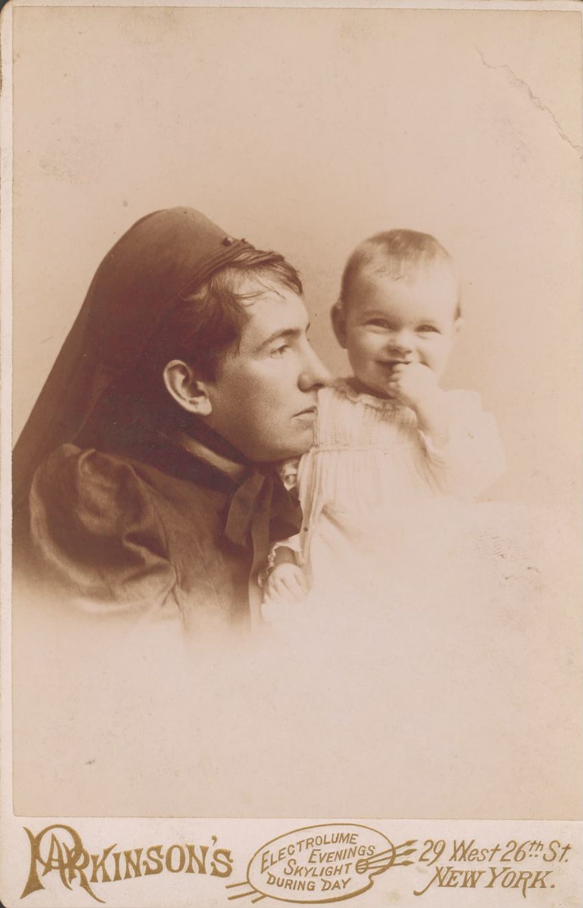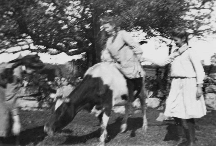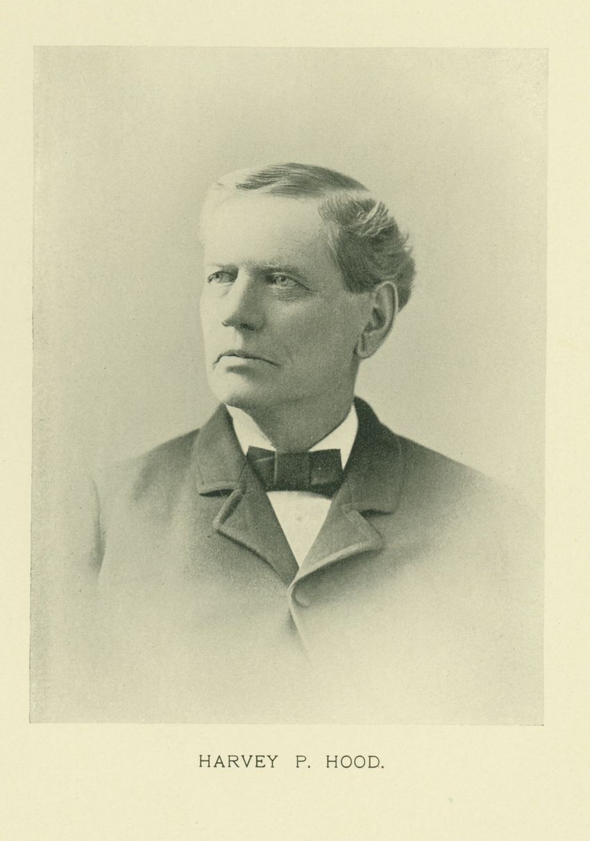 A Hood Milk delivery man stands with his horse and wagon. The wagon is decorated with a cow being milked and reads "Hood's Milk Stands Every..." with the rest of the words obscured by the milkman.