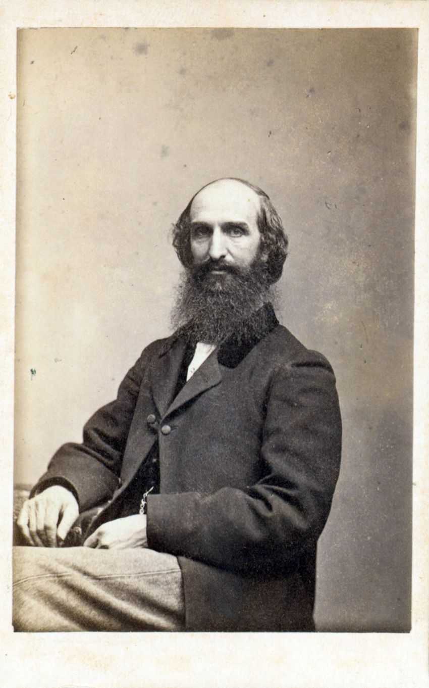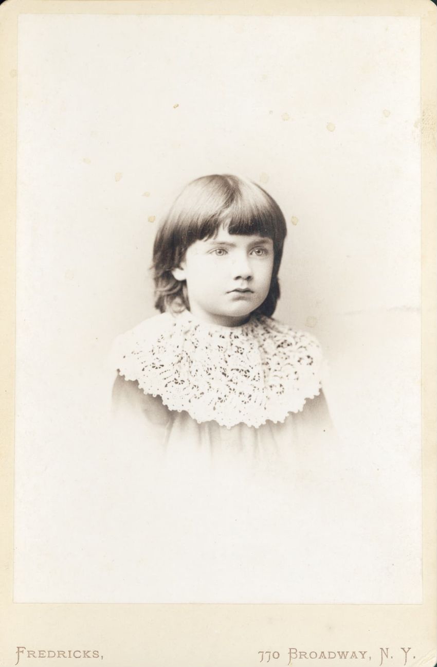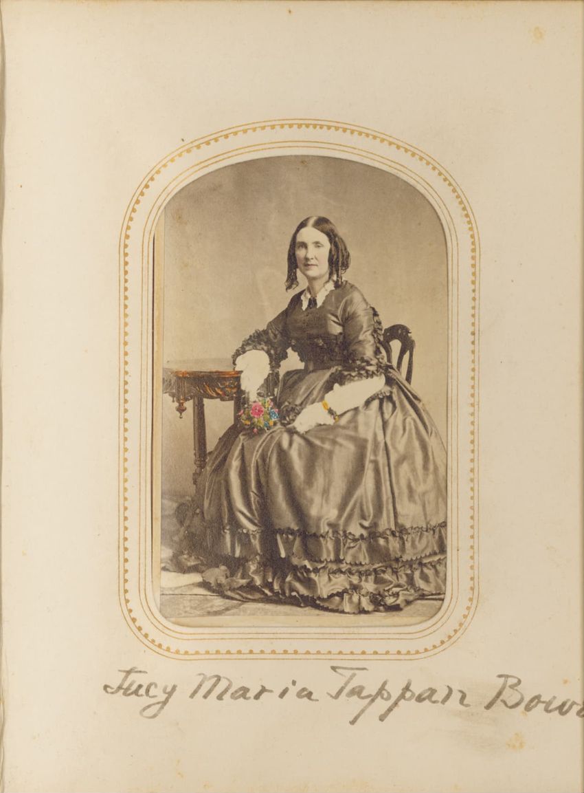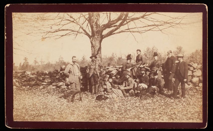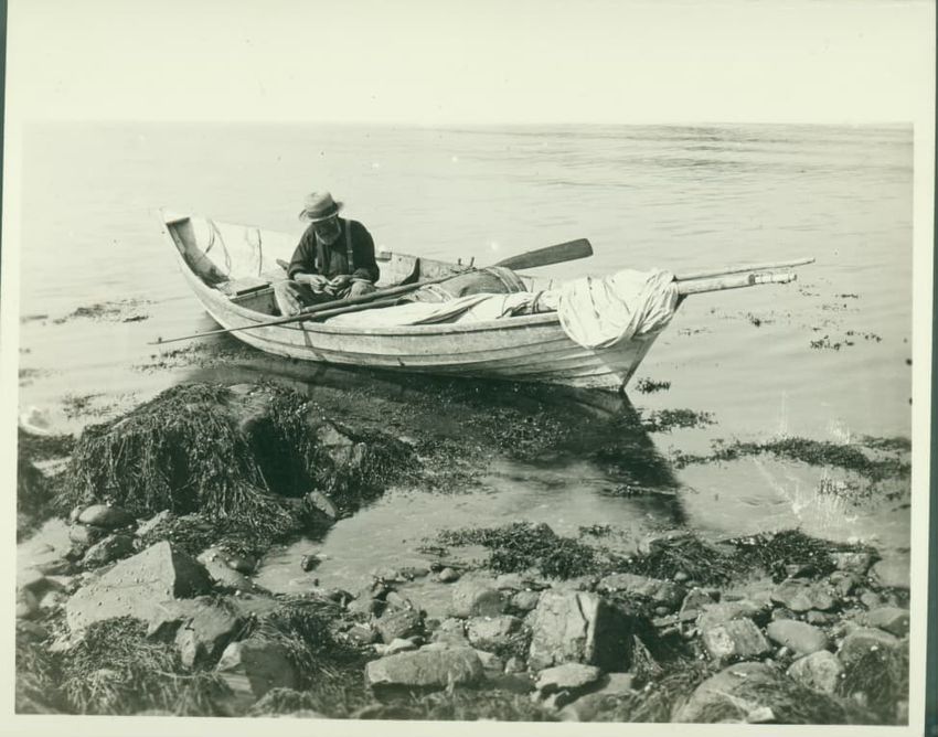 A Hood Milk delivery man stands with his horse and wagon. The wagon is decorated with a cow being milked and reads "Hood's Milk Stands Every..." with the rest of the words obscured by the milkman.