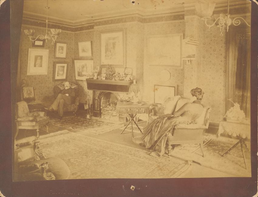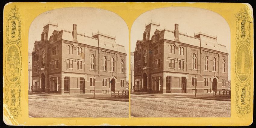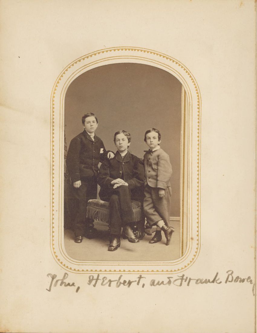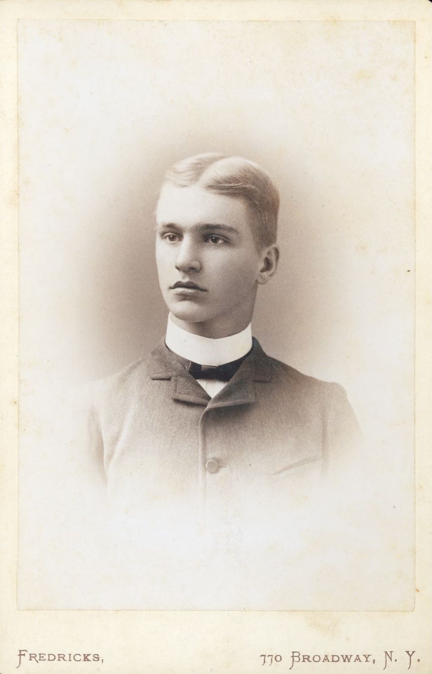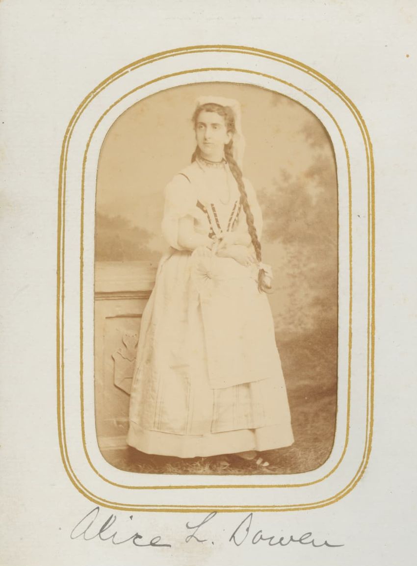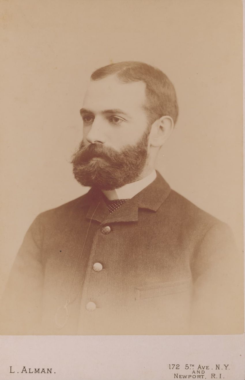 A Hood Milk delivery man stands with his horse and wagon. The wagon is decorated with a cow being milked and reads "Hood's Milk Stands Every..." with the rest of the words obscured by the milkman.