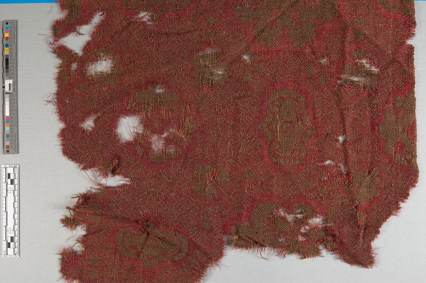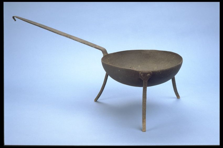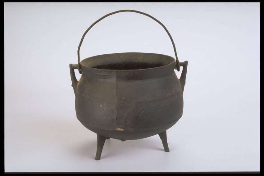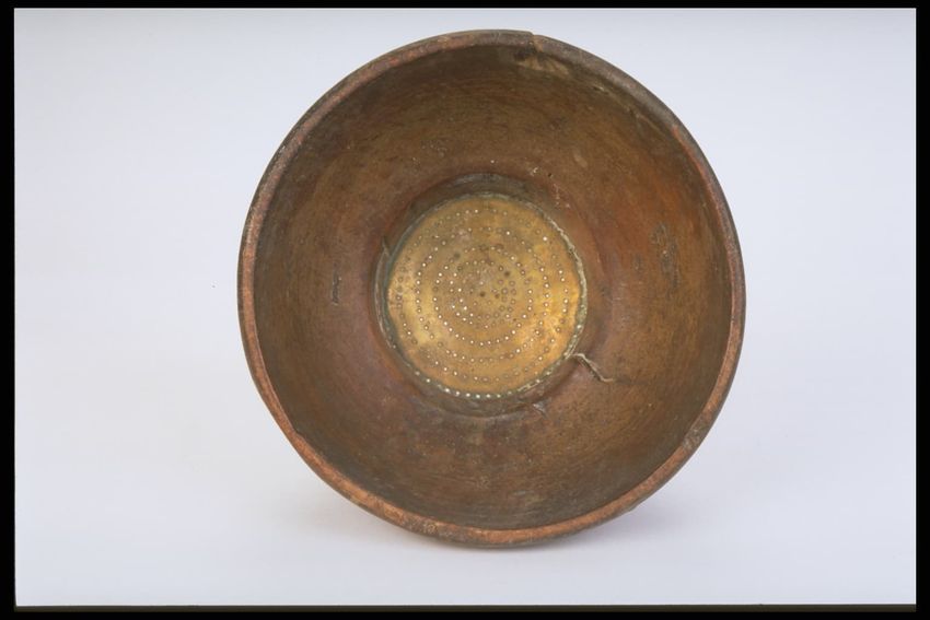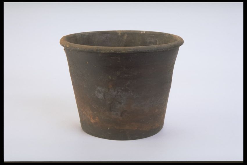 Thick redware beanpot of squat globular shape with outflaring rim, uncovered, brown glaze inside, unglazed outside, incised in bold capital letters, "M. MARSHALL." above an incised band.