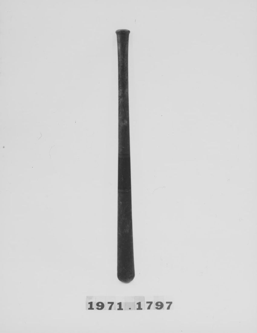 Flat ovoid base, hollow inside, and is painted tan overall. Man and woman embracing - the woman wears a long full skirt, short coat with puffled sleeves and peplum; the man wears long stockings, a short coat, a ruffled collar and cap. seventeenth century style.