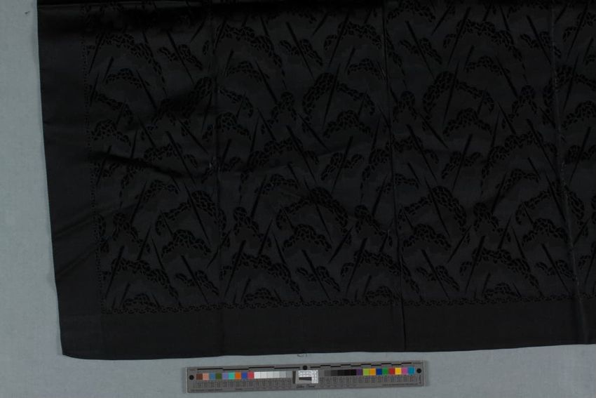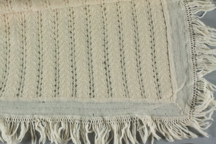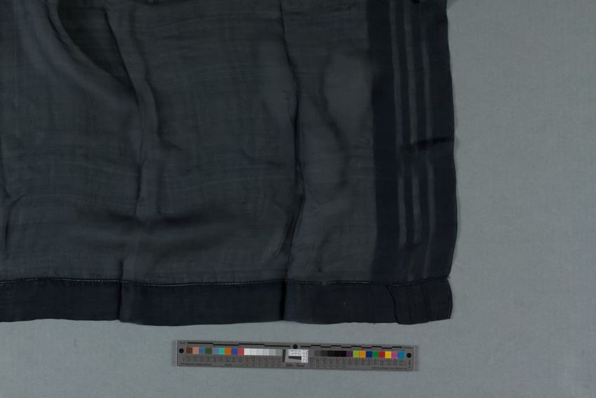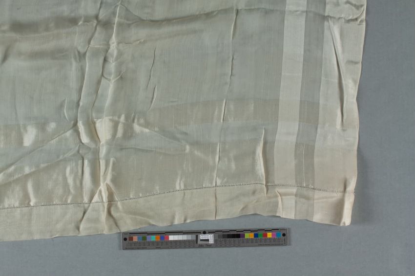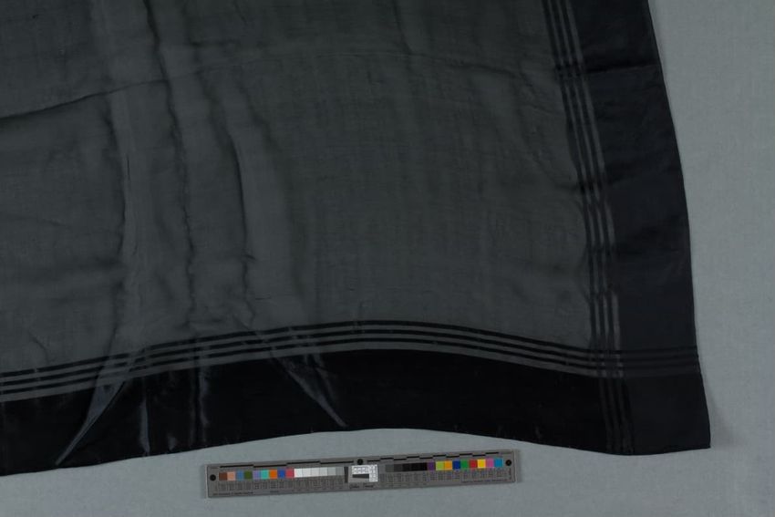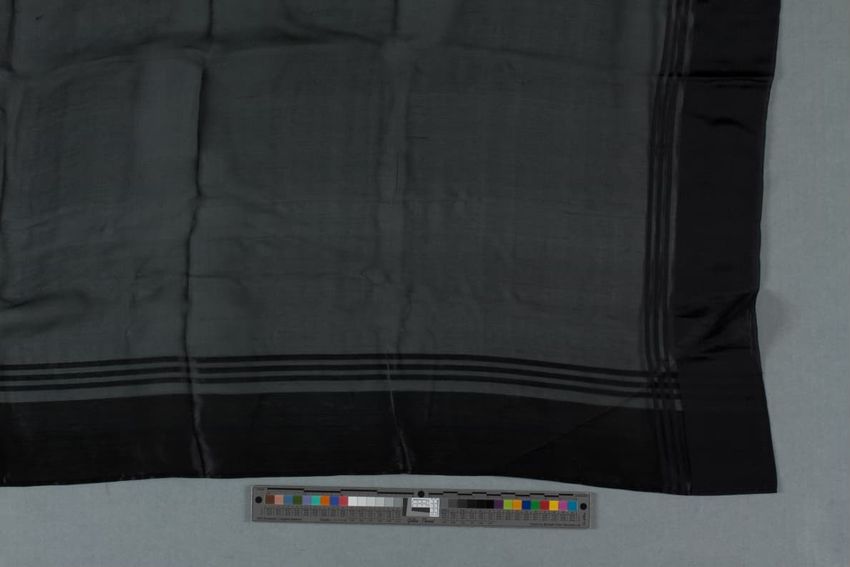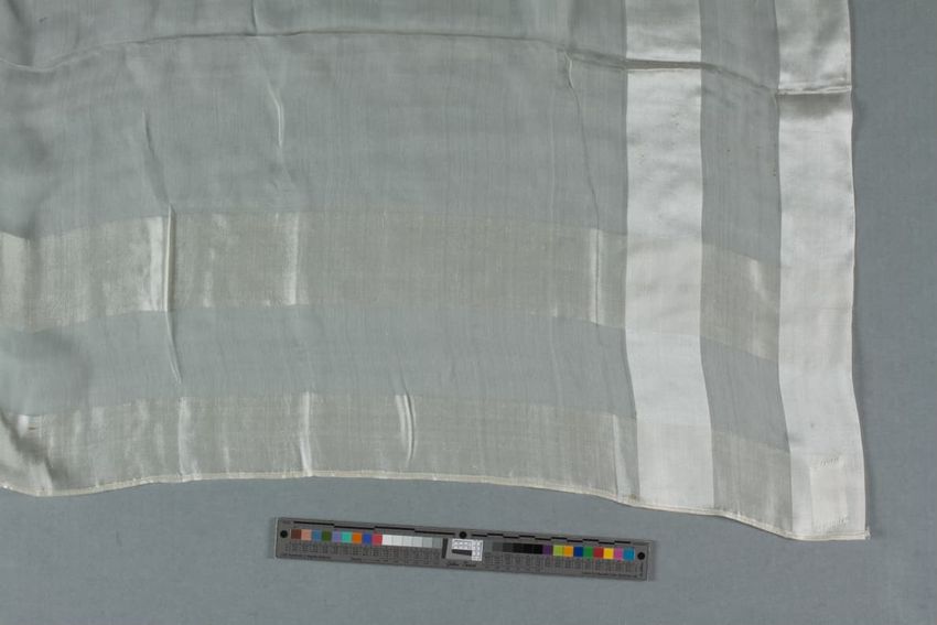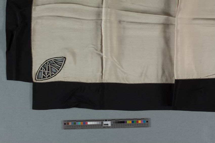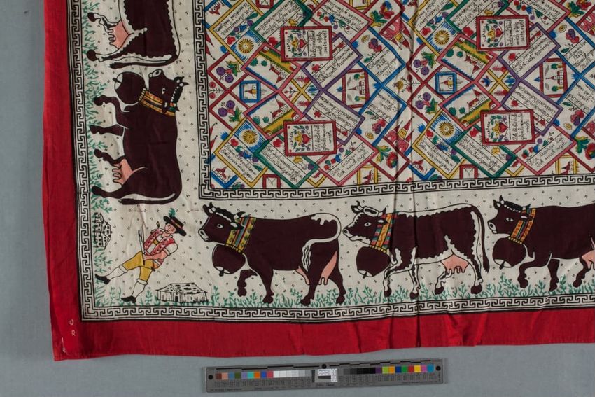 Red cotton; square shape; bouquets of wildflowers in each corner, with border of shields in various shapes, sizes and colors, representing towns/cities in Switzerland; in blues, yellow, green, orange; narrow border of stripes in white, black, and orange.